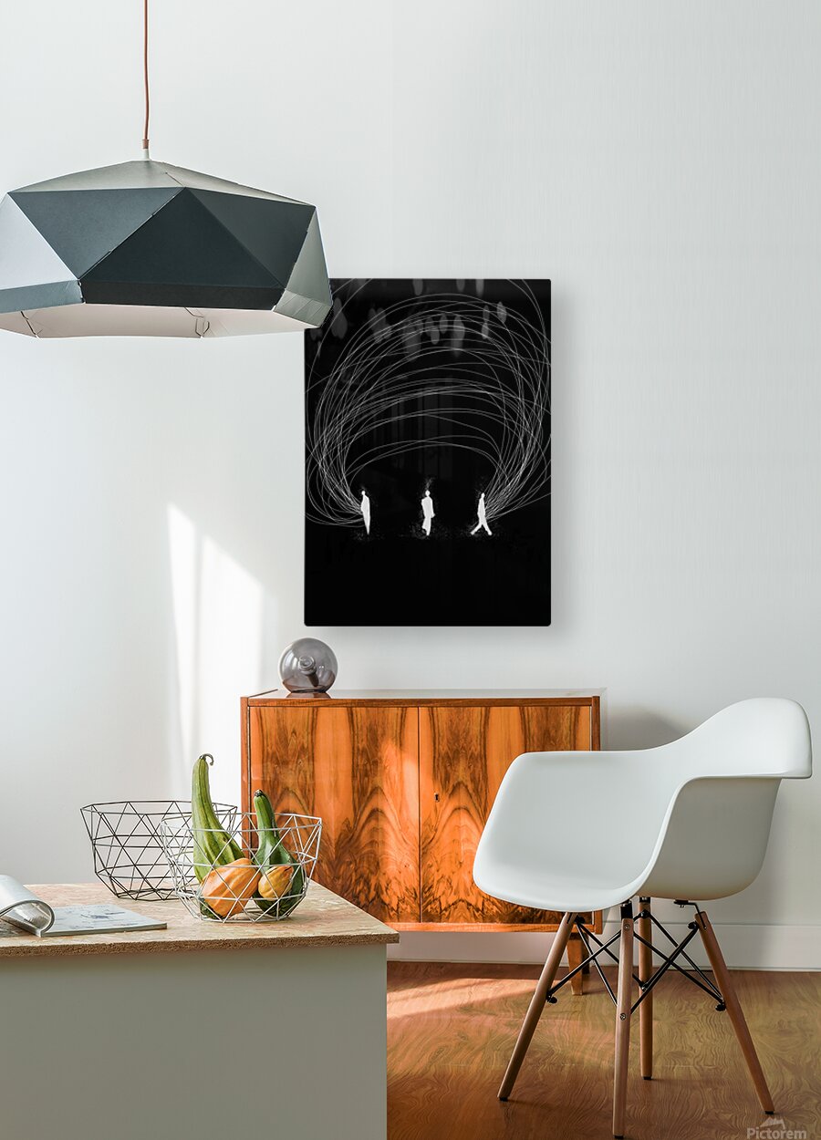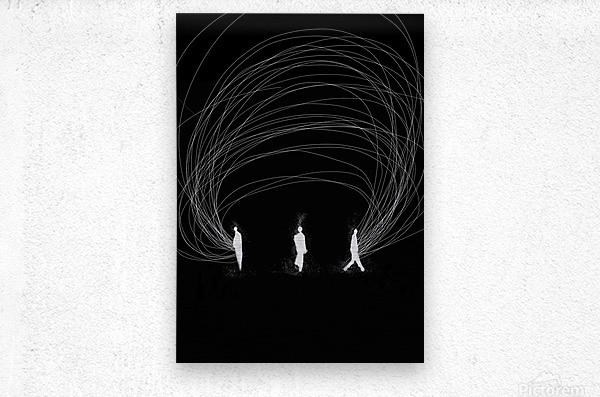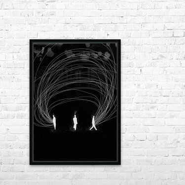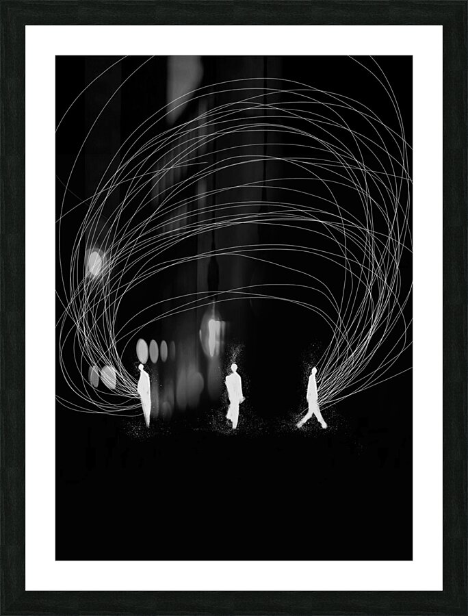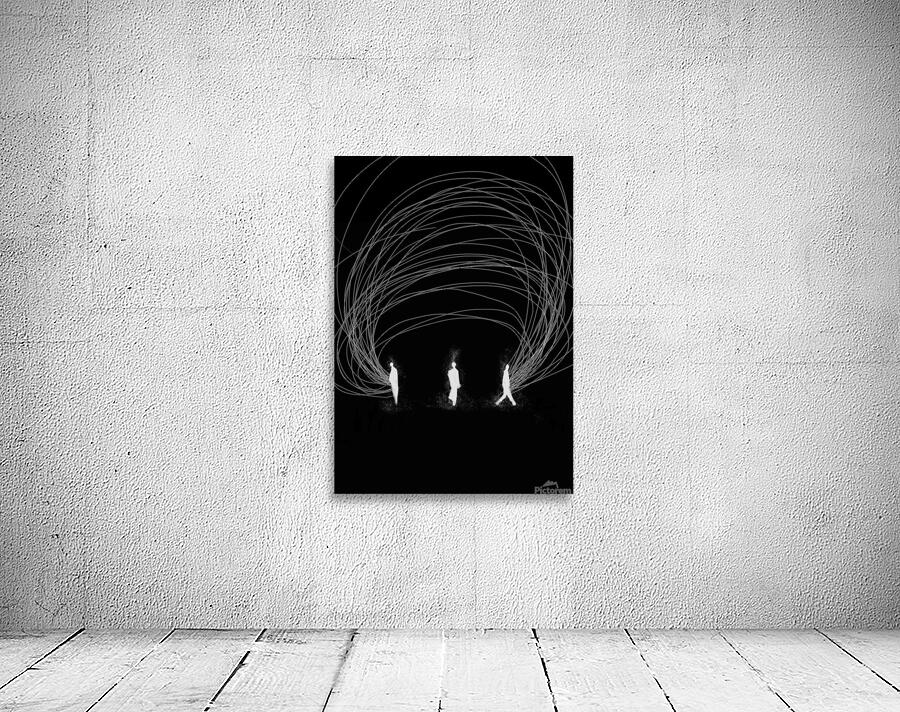 Against a deep black background three figures stand apart embodying the space between them. Each figure is isolated yet subtle lines extend between them forming delicate connections that suggest an invisible bond. The contrast of light and dark along with the sharpness of the lines emphasizes both the emotional and physical distance creating a powerful tension between solitude and unity. The black backdrop enhances the figures’ stark presence drawing the viewer into a reflection on the complexities of human relationships and the threads that tie us together even in moments of separation.