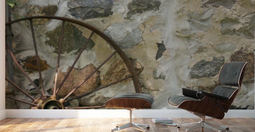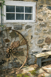 RUSTY WHEEL AND STONE WALL