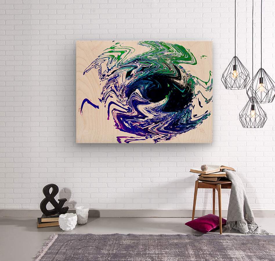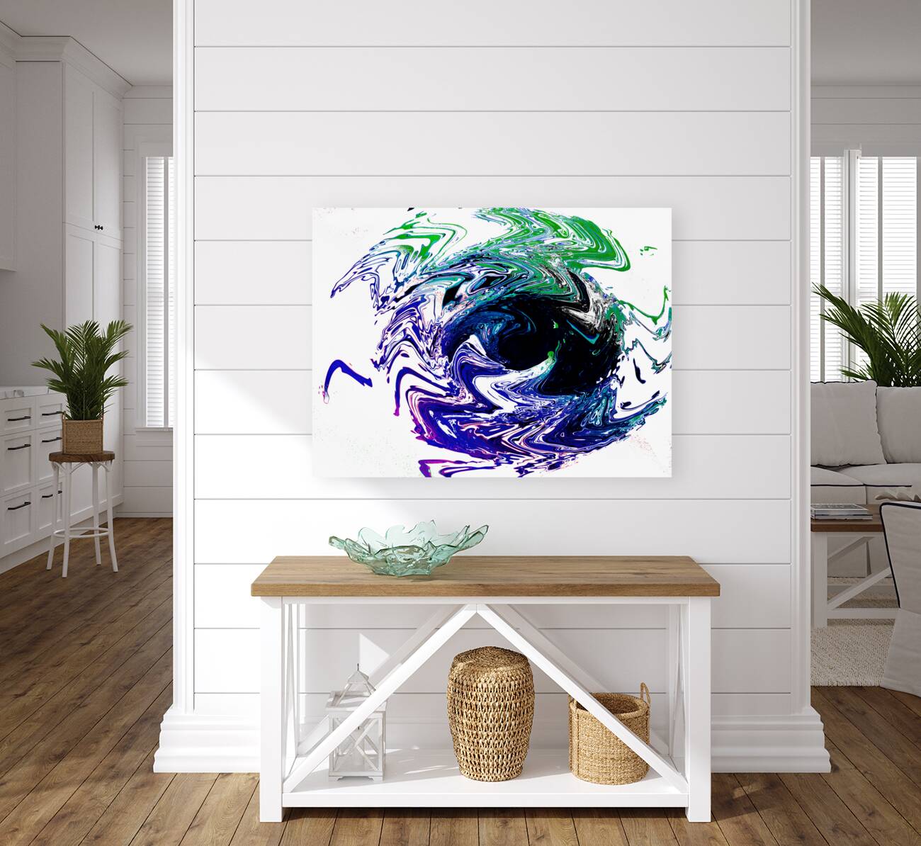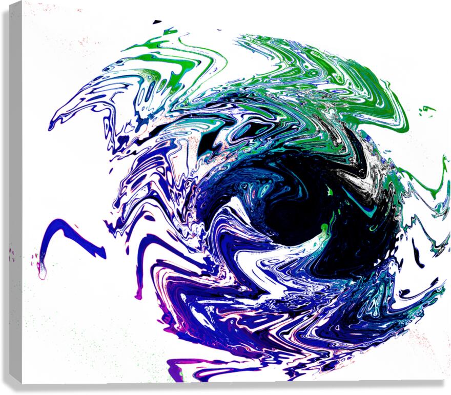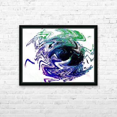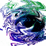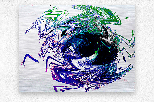 Originally a close up photo of a Daisy flower laterally digitally manipulated (using various artistic filters in canva.com) into a stunning piece of contemporary modern art. Features a swirling vortex of vibrant colors which dominates the scene, with green, purple, and blue hues blending into an intense, black center. The dynamic, flowing lines create a sense of motion and energy.