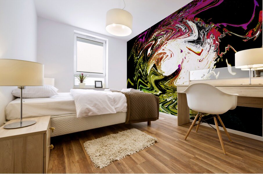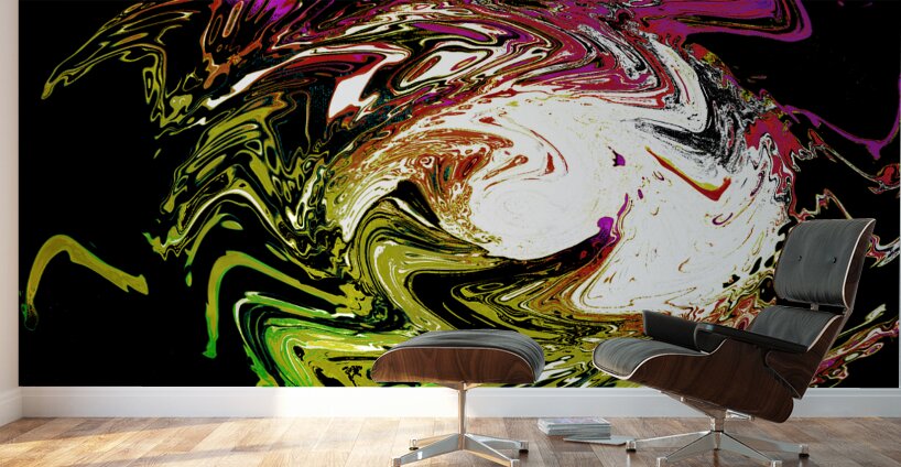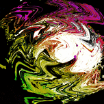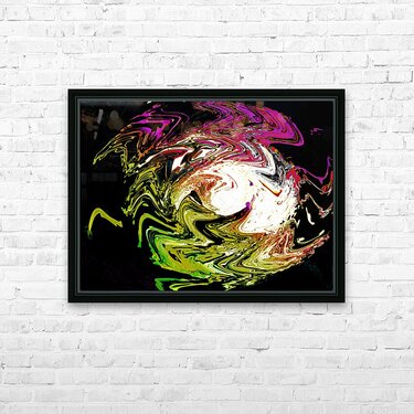 Originally a close up photo of a Daisy flower laterally digitally manipulated (using various means including artistic filters in canva.com) enabled this stunning piece of modern contemporary art to emerge. Features a swirl of vibrant colors, including green, white, and purple, which creates an abstract and dynamic pattern against a dark background. The feeling of movement is intensified by the bold and flowing lines.
