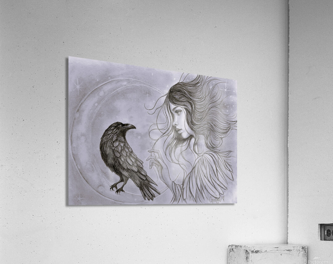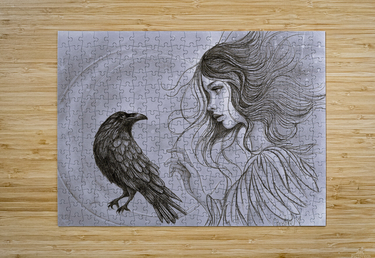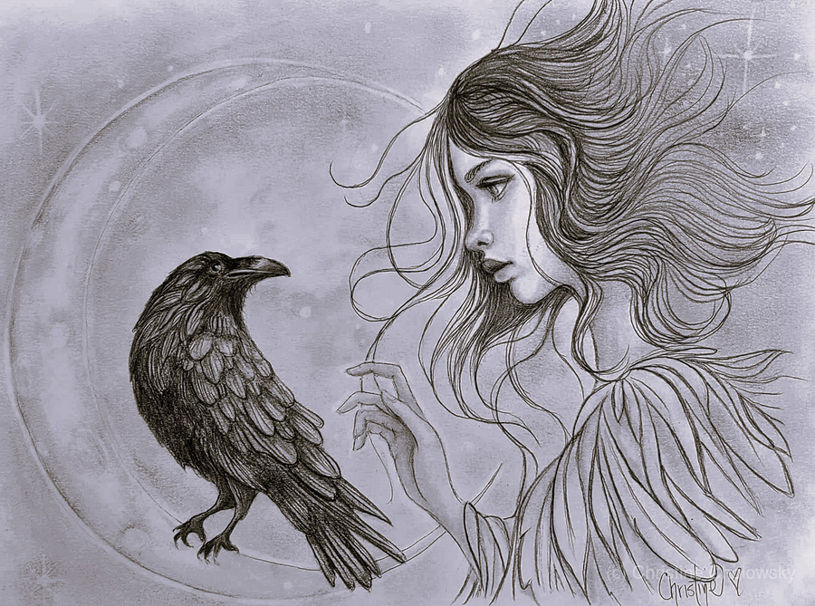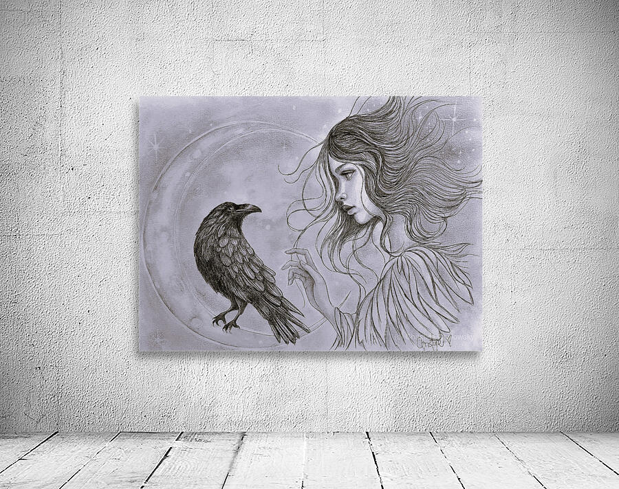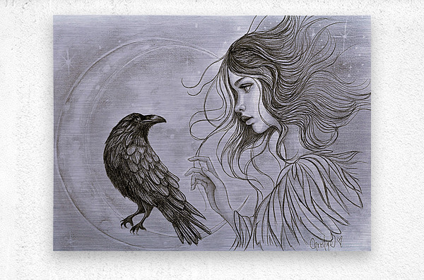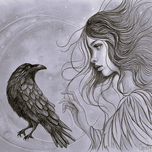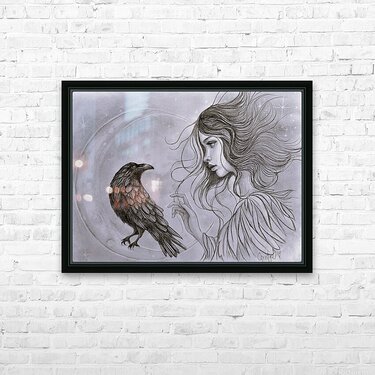 A woman with flowing hair gazes intently at a raven perched near her with softly glowing stars in the background. The monochromatic composition emphas...[+]