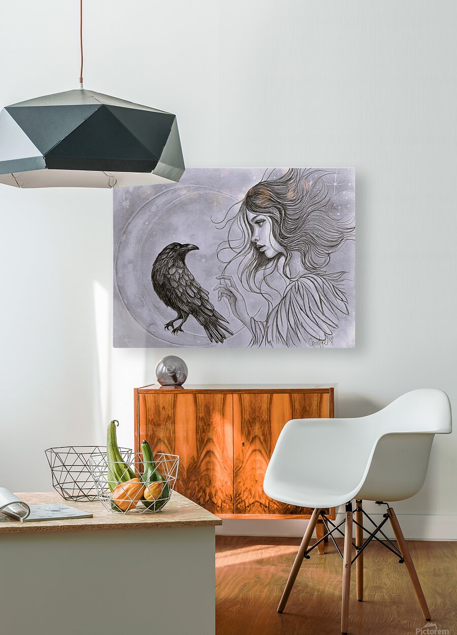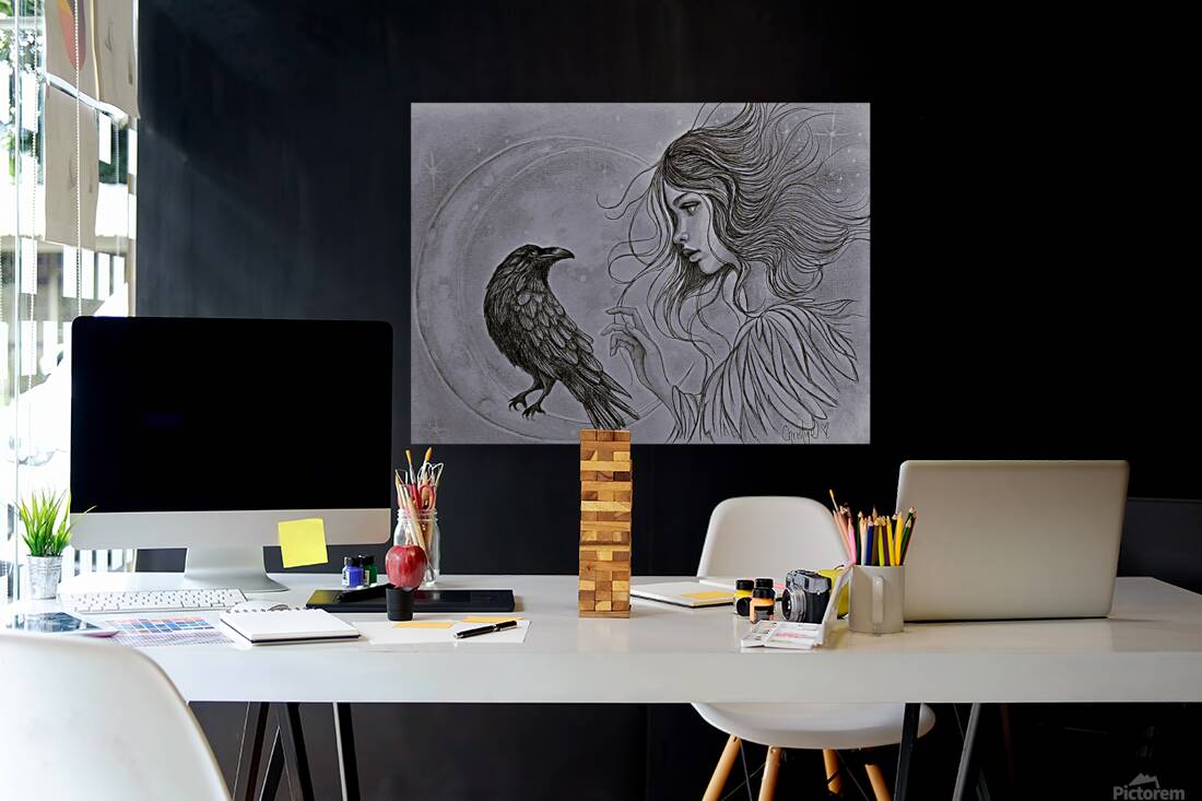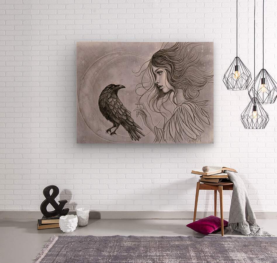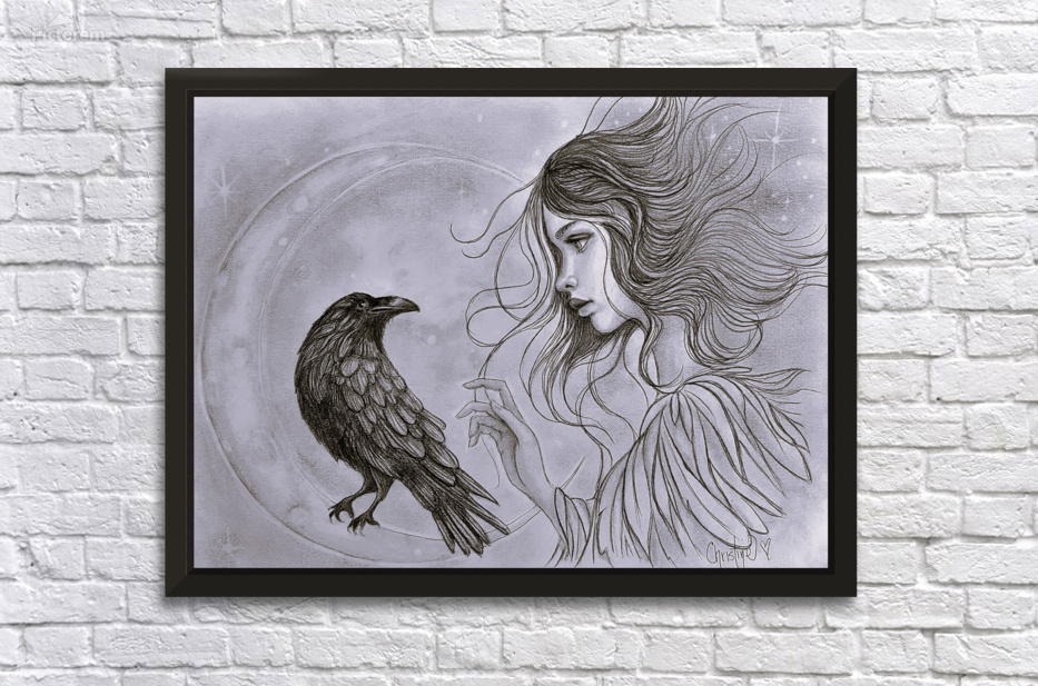 A woman with flowing hair gazes intently at a raven perched near her with softly glowing stars in the background. The monochromatic composition emphas...[+]