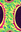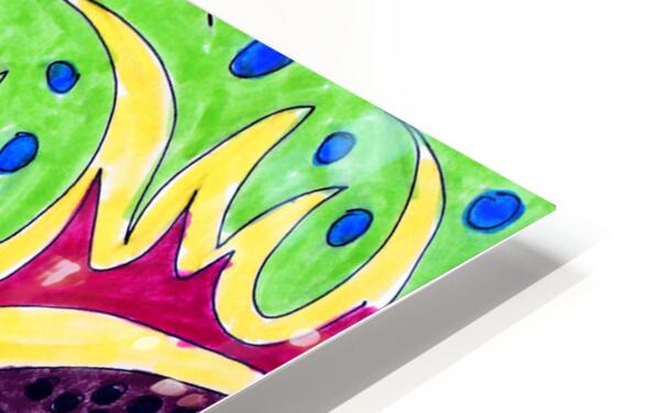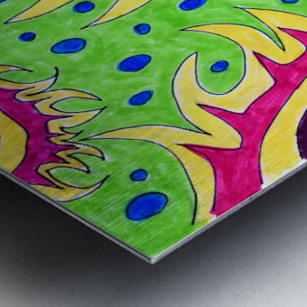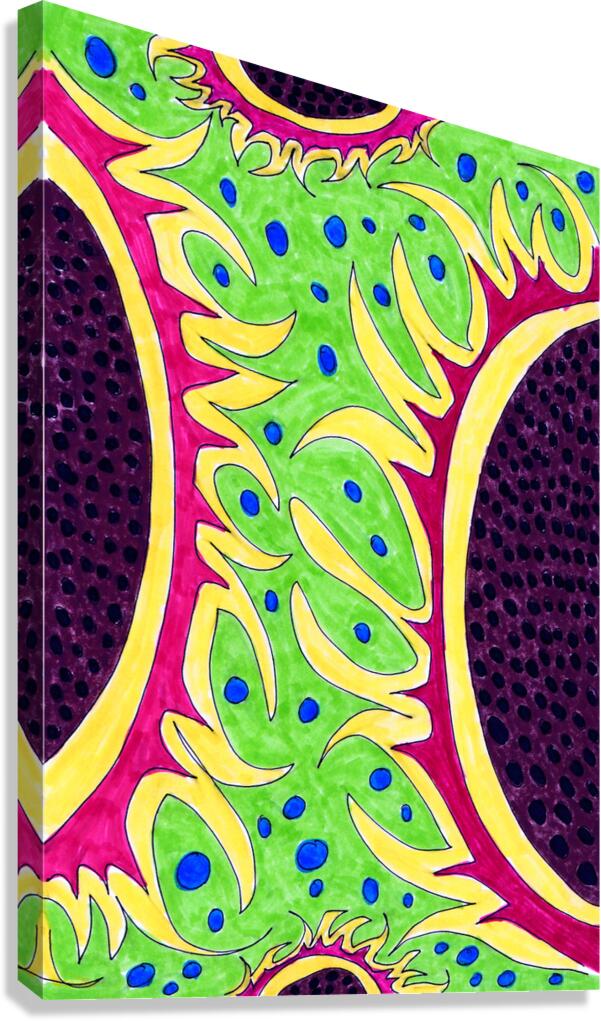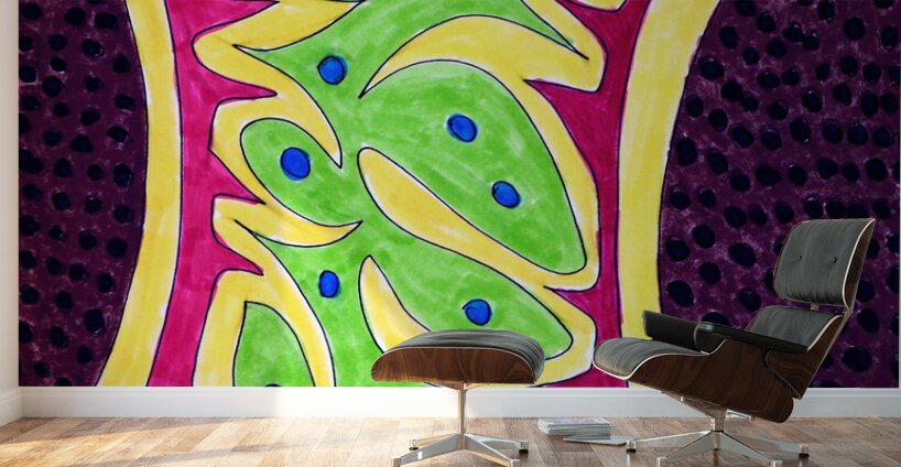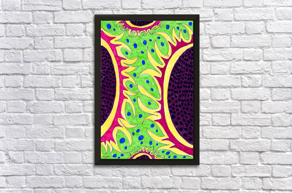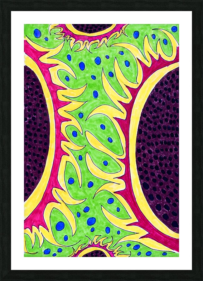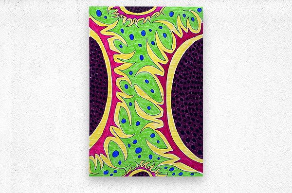 A hand drawn composition created from imagination using coloured ink markers and paper. Features a vibrant flowing green shapes with blue dots against a red and yellow background, all bordered by a dark purple area with black spots. The design is organic and dynamic, with a symmetrical structure.