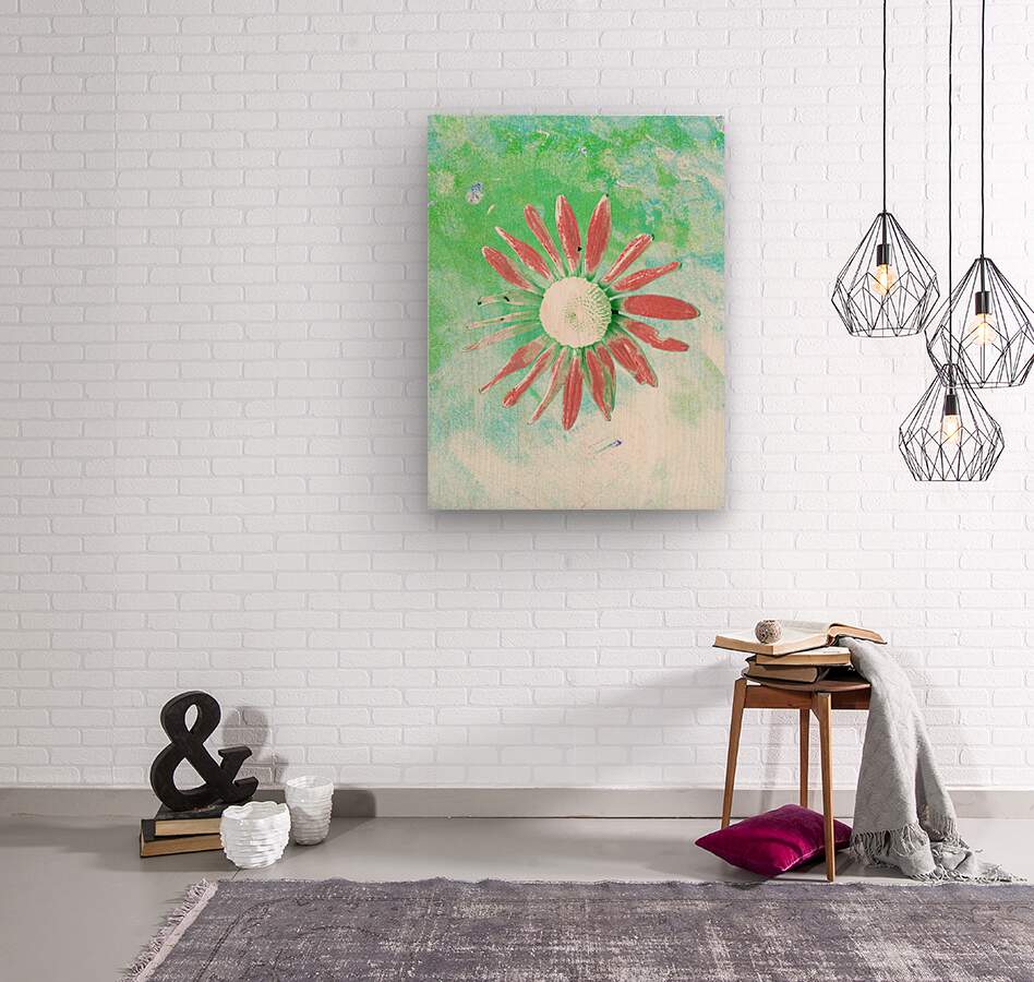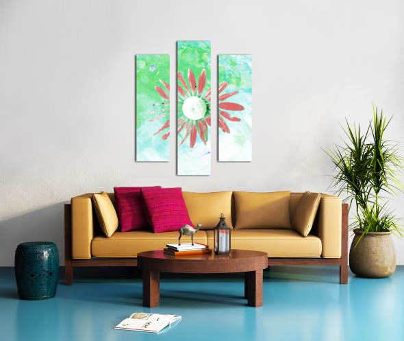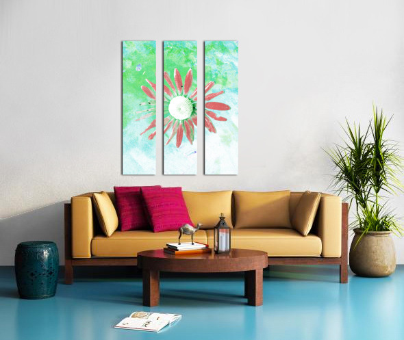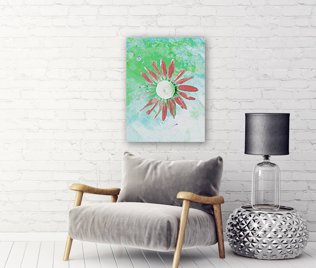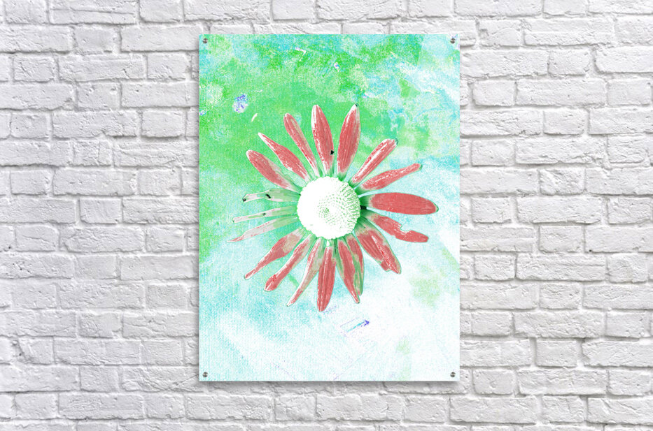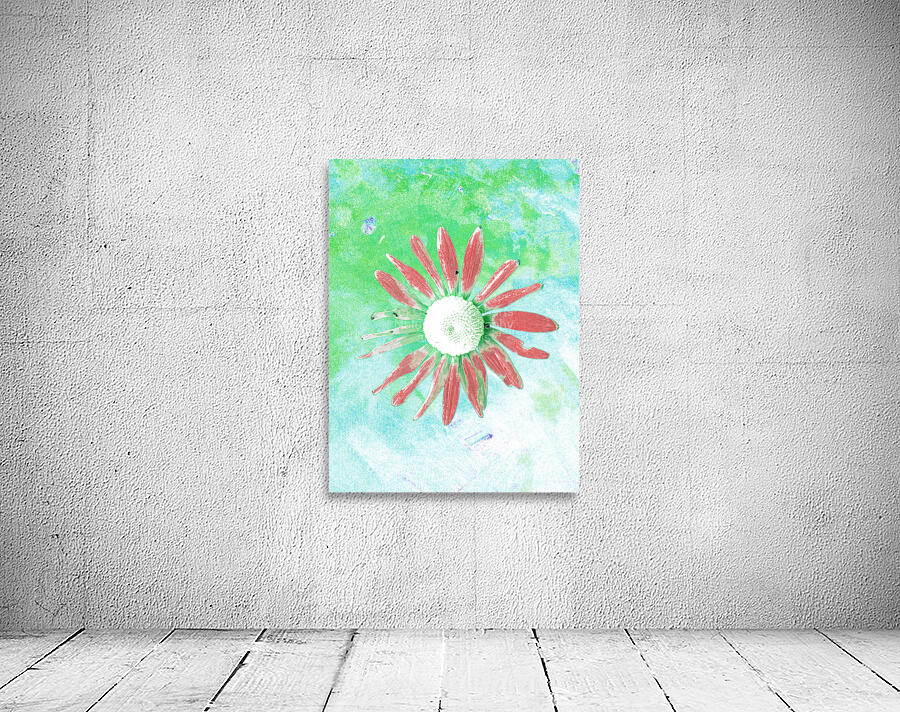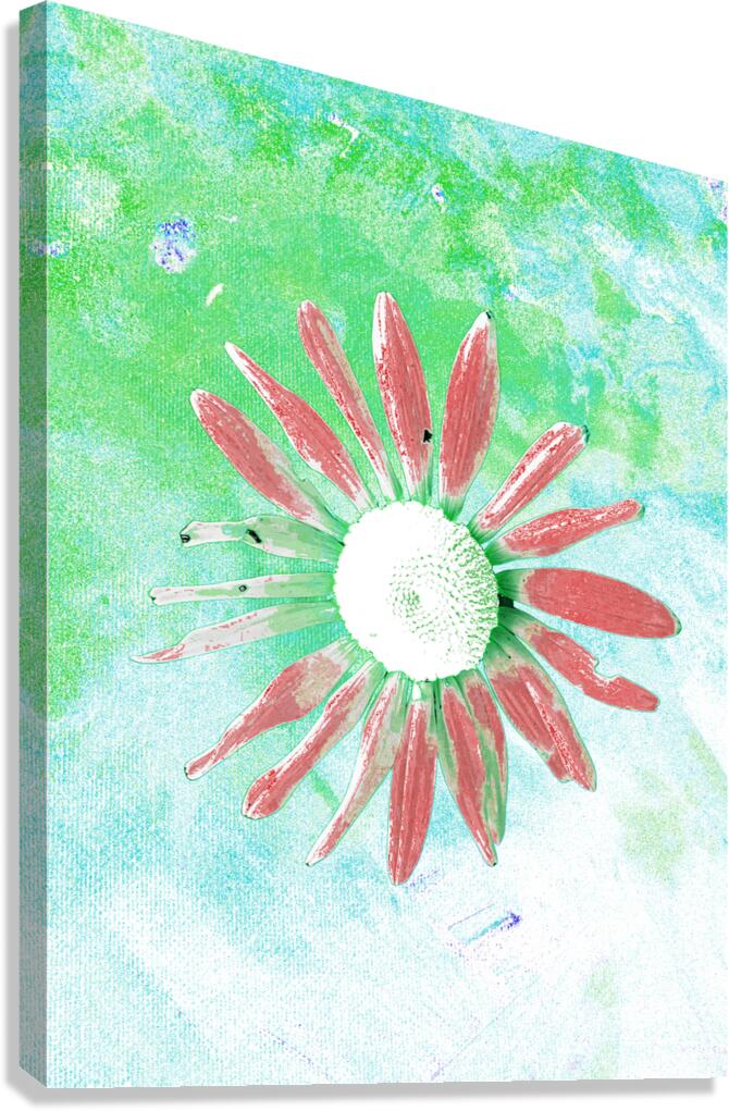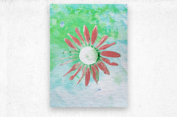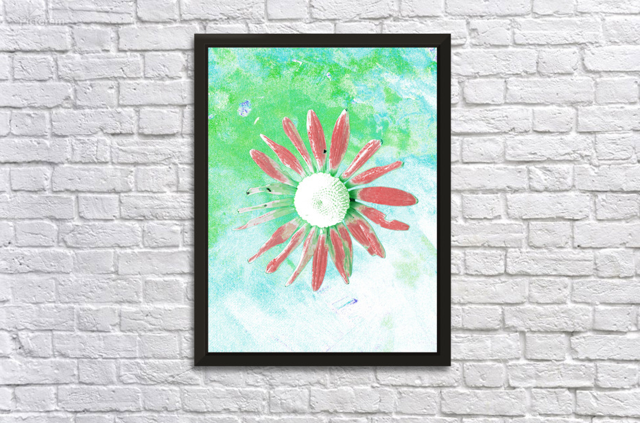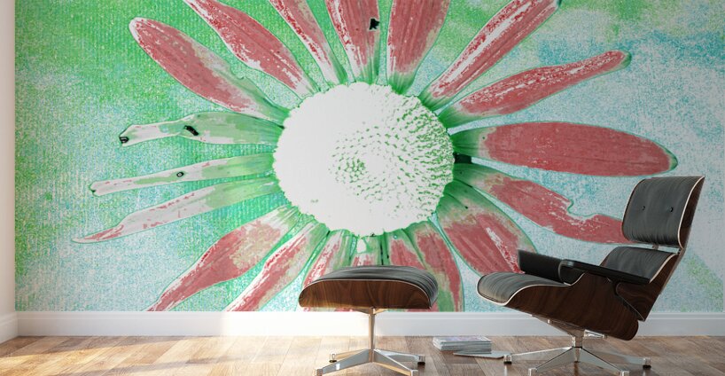 Originally a hand painted acrylic and a close up photo of a Daisy flower laterally combined and digitally manipulated to create this stunning piece of floral contemporary art. Features a vibrant Daisy with pink petals and a white center set against a pastel green and blue background. The overall effect is both refreshing and artistic, creating a lively yet calming visual.