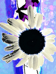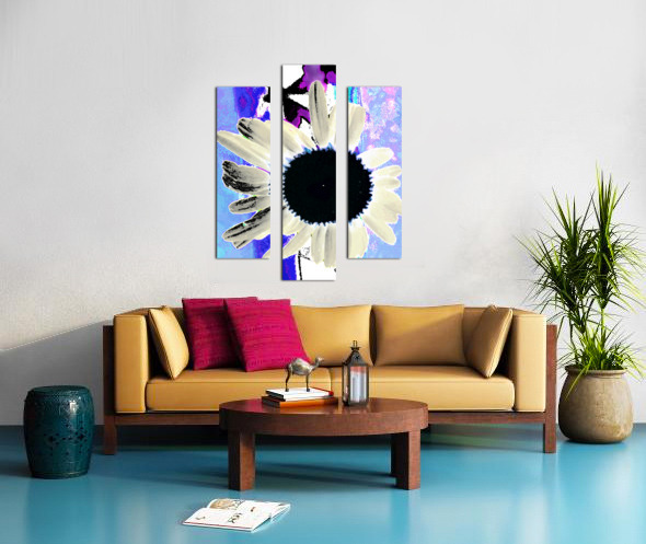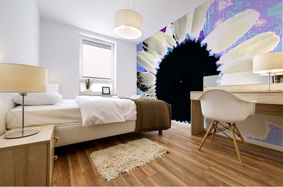 Originally a close up photo of a Daisy flower laterally digitally manipulated into a stunning piece of floral contemporary art. Features a vibrant and abstract depiction of a Daisy with a dark center set against a colorful, mixed background. The flower's petals extend outward, contrasting sharply with the vivid blue, purple, and pink hues behind it.