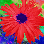 Originally a close up photo of a Daisy flower and an abstract photo of a tree through a misty, rain soaked window, laterally digitally manipulated into stunning piece of abstract contemporary art. Features a vibrant red Daisy with a dark center standing out against a psychedelic background of greens, blues, and purples. The intense colors create a striking contrast that grabs attention and evokes a sense of energy.