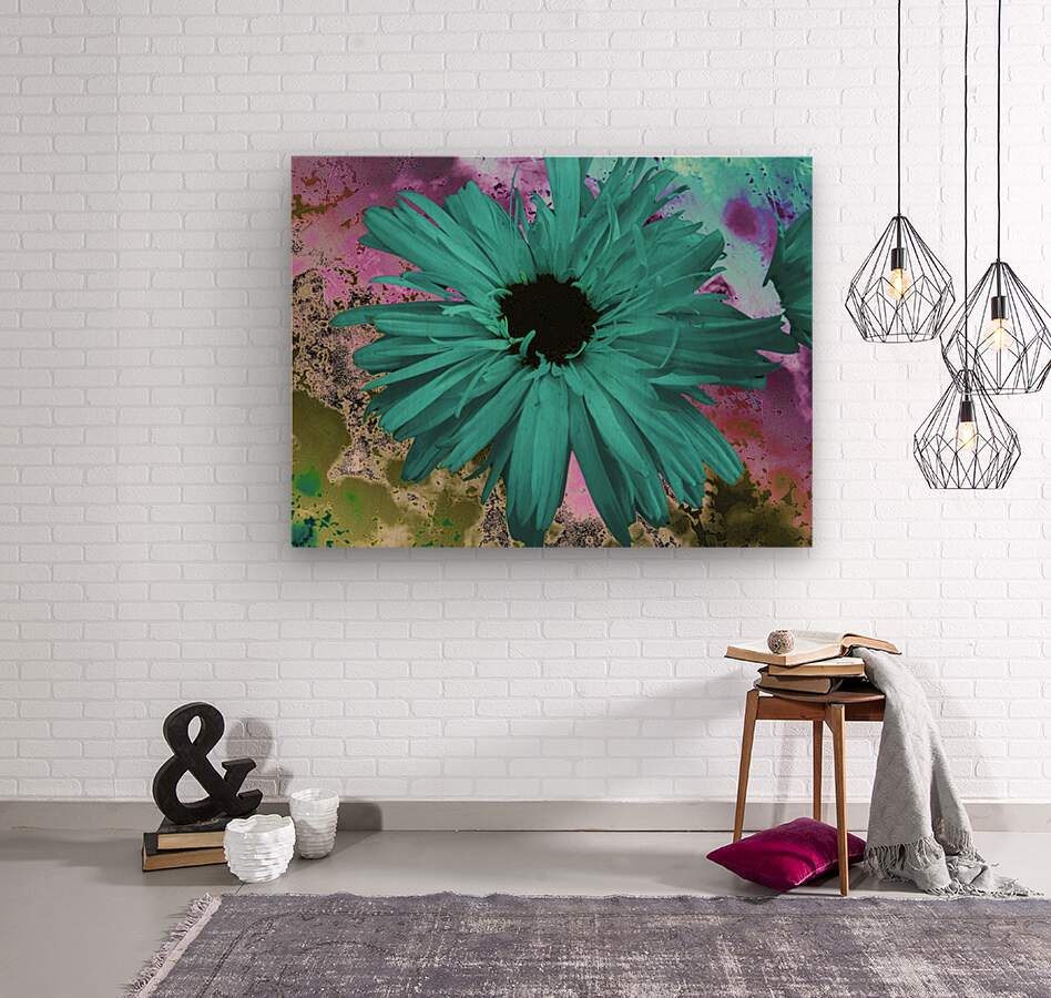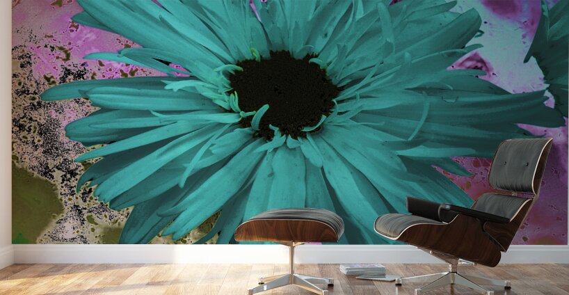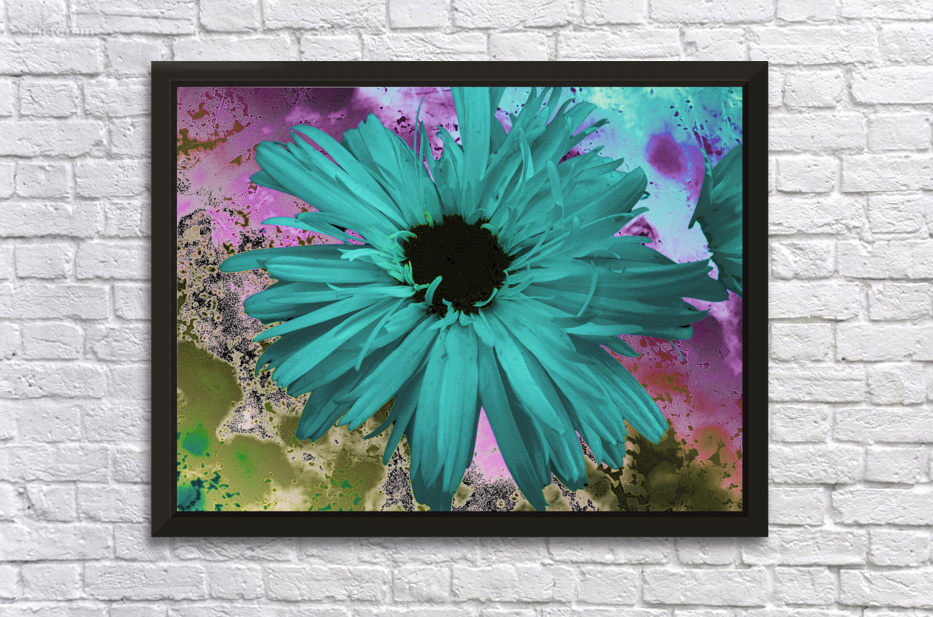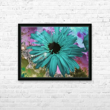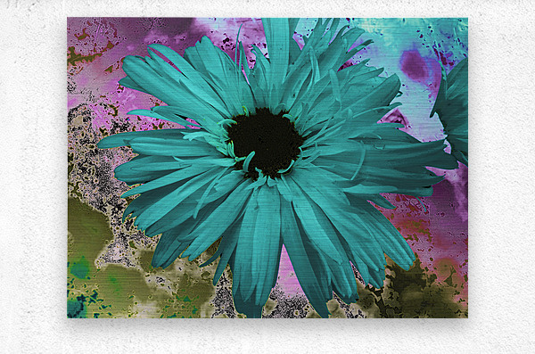Originally a close up photo of a Daisy flower and an abstract photo of a tree through a misty, rain soaked window, laterally digitally combined and further enhanced to create a stunning piece of floral contemporary art. Features a vibrant teal Daisy standing out against a colorful and abstract background, featuring hues of purple, pink, and green. The bold interplay of colors creates a striking visual contrast.
