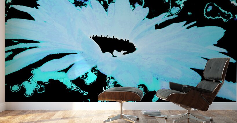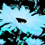 Originally a close up photo of Daises laterally digitally manipulated into a stunning piece of floral contemporary art. Features a large Daisy with a glowing blue hue which stands out against a dark background. The abstract style includes swirling outlines and patterns around the flower, enhancing its vibrant, ethereal appearance.