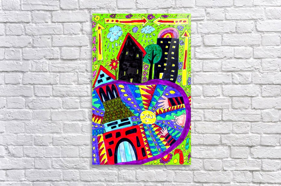 A hand drawn doodle inspired design created using coloured ink pens and paper. Features bright, vivid colors which dominate a whimsical scene featuring geometric shapes and abstract buildings under a sky filled with clouds and arrows. Two hands seem to reach out from the side towards a bright, radiating sun in the center.