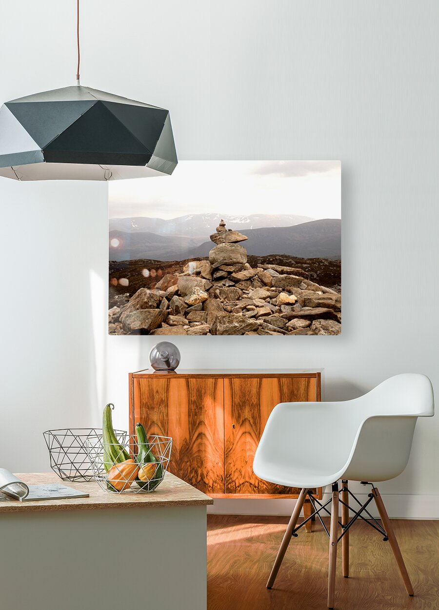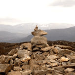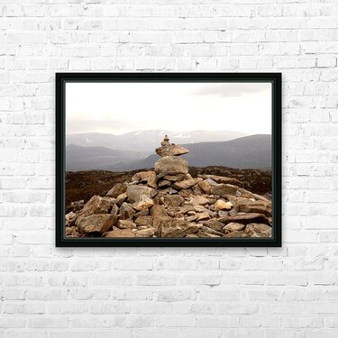 I took this shot during a wonderful walk up Craigellachie in the Scottish Highlands. The views were stunning and I couldn't resist capturing these balancing stones with such a backdrop. The carefully balanced cairn stands amidst a field of scattered rocks, with a backdrop of rolling mountains under a cloudy sky. The scene exudes tranquility and a sense of rugged natural beauty.
