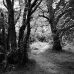 A high contrast Black and White photo featuring a narrow dirt path winding through a dense forest, with tall, leafy trees on both sides. The scene is in black and white, giving it a timeless and serene atmosphere.