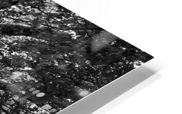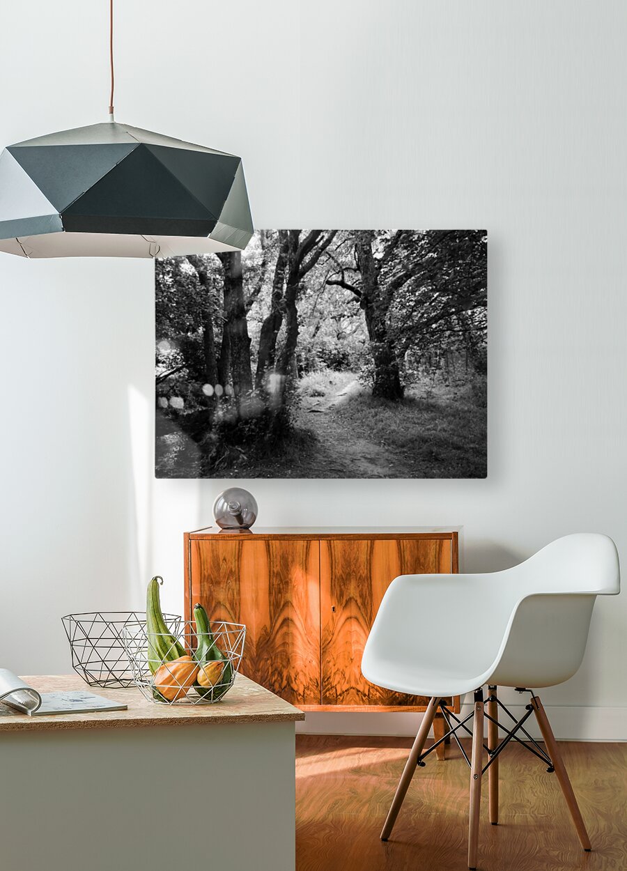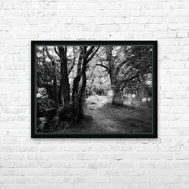 A high contrast Black and White photo featuring a narrow dirt path winding through a dense forest, with tall, leafy trees on both sides. The scene is ...[+]