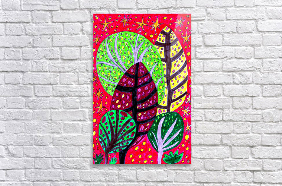 Hand drawn design created using coloured ink pens and paper. Features a brightly colored whimsical scene presenting five trees with patterned leaves set against a red background adorned with stars and dots. The vibrant greens and yellows of the leaves contrast sharply with the red, infusing the image with a sense of playful energy.