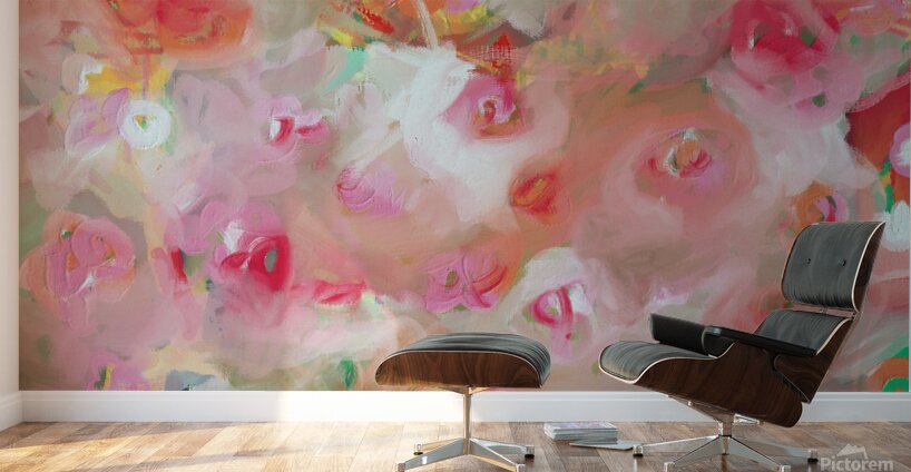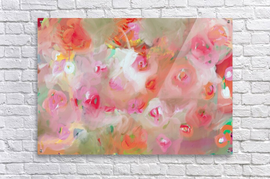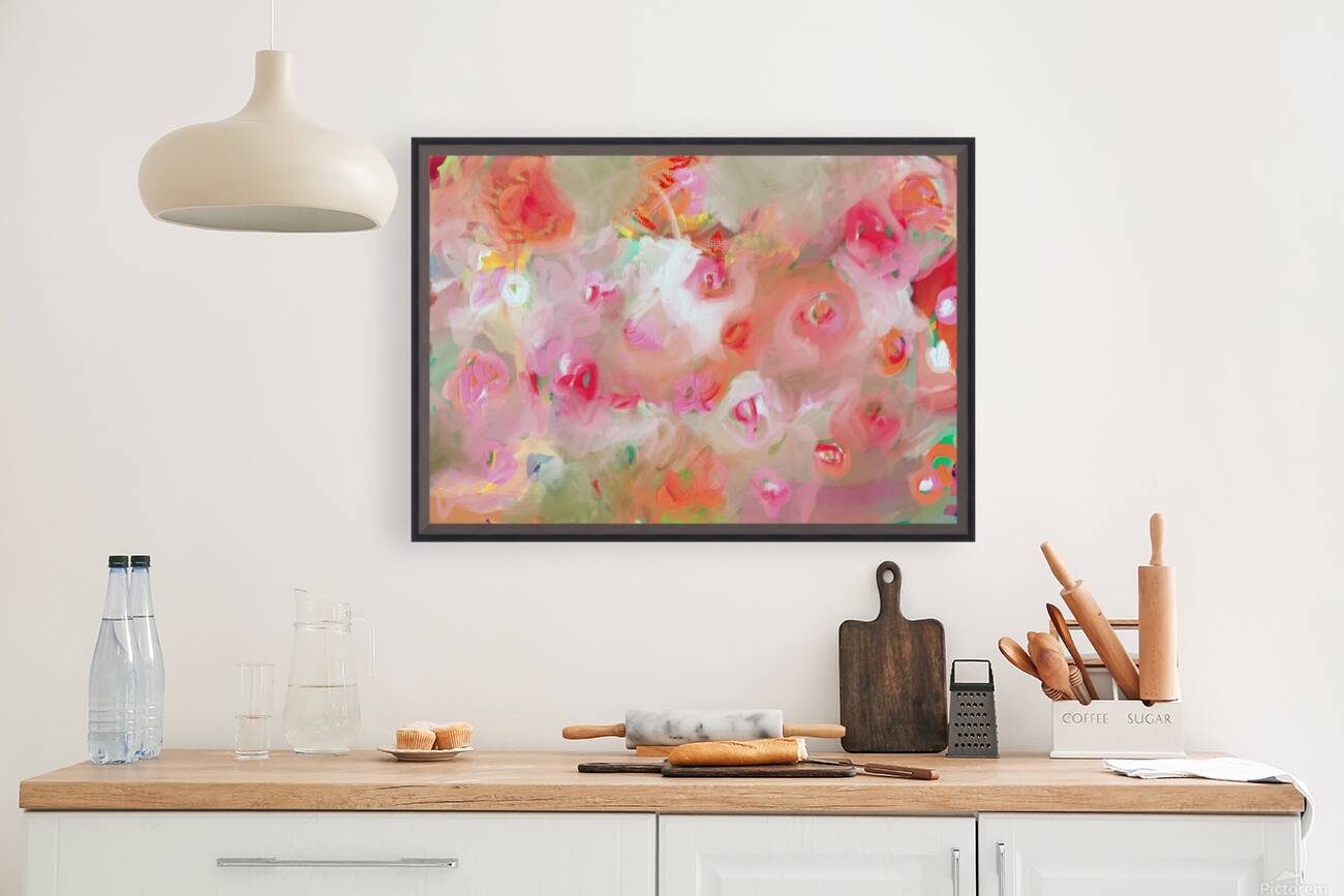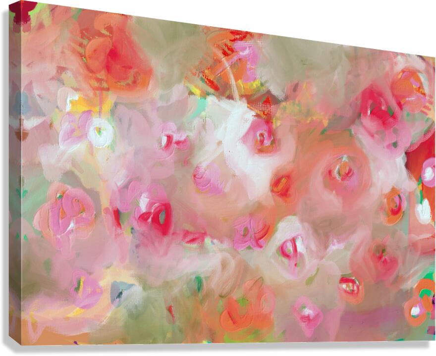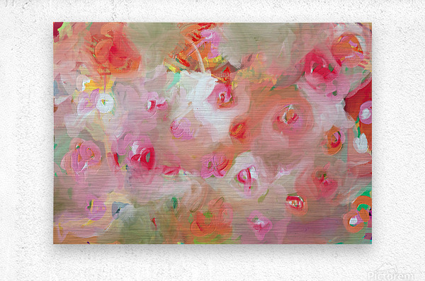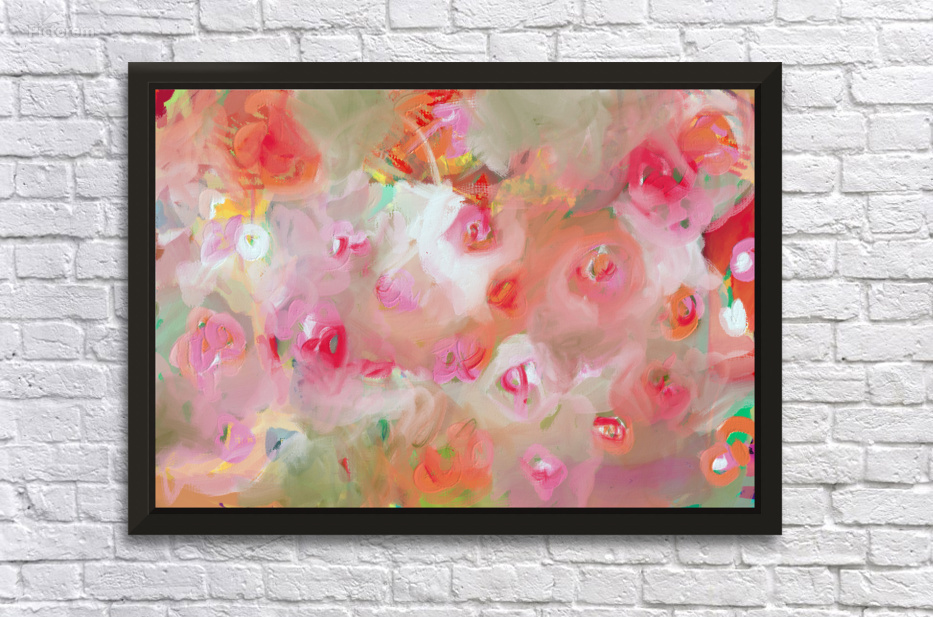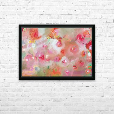 Rosy Options is a cheerful composition with an impressionistic pattern of roses amid soft pastel tones . It is meant to bring a calm exhale to your busy day. The artwork is an abstract painting featuring a vibrant blend of swirling colors. Predominantly, various shades of pink and peach intertwine with touches of white, orange, and green. The forms resemble loosely defined flowers, giving the piece a dynamic, lively feel. The brushstrokes are soft and fluid, contributing to a dreamy, ethereal quality.