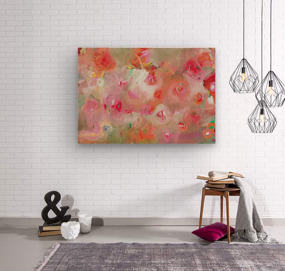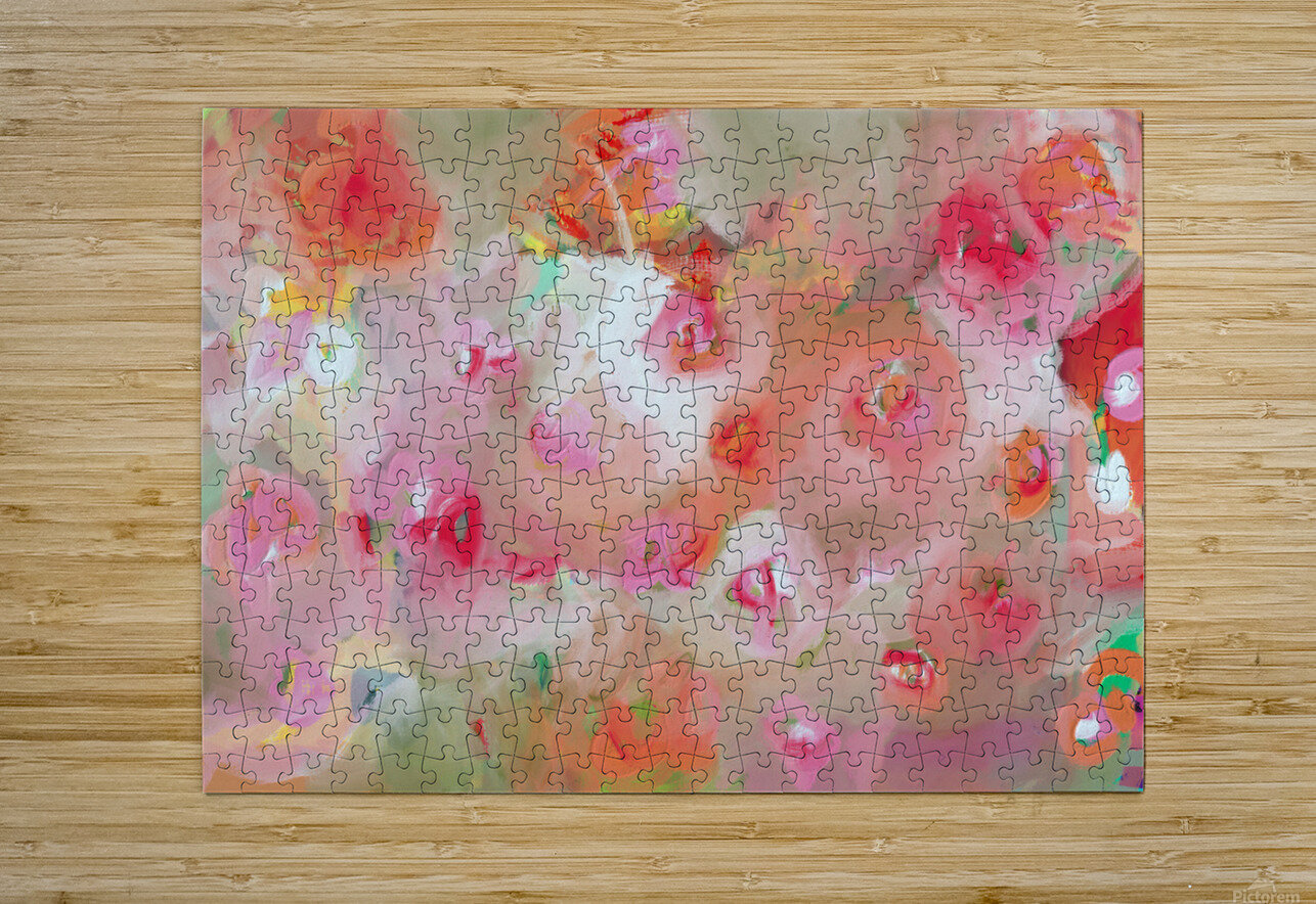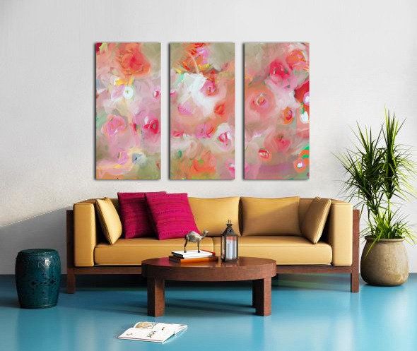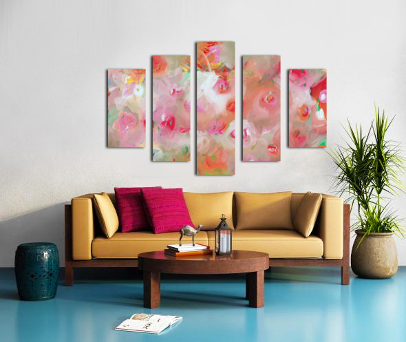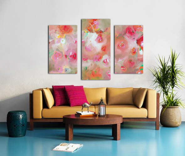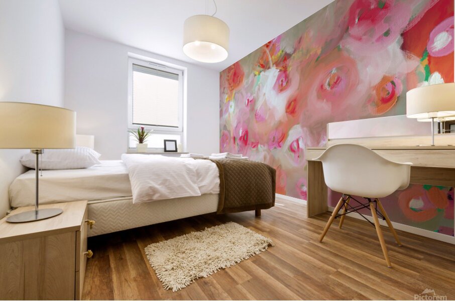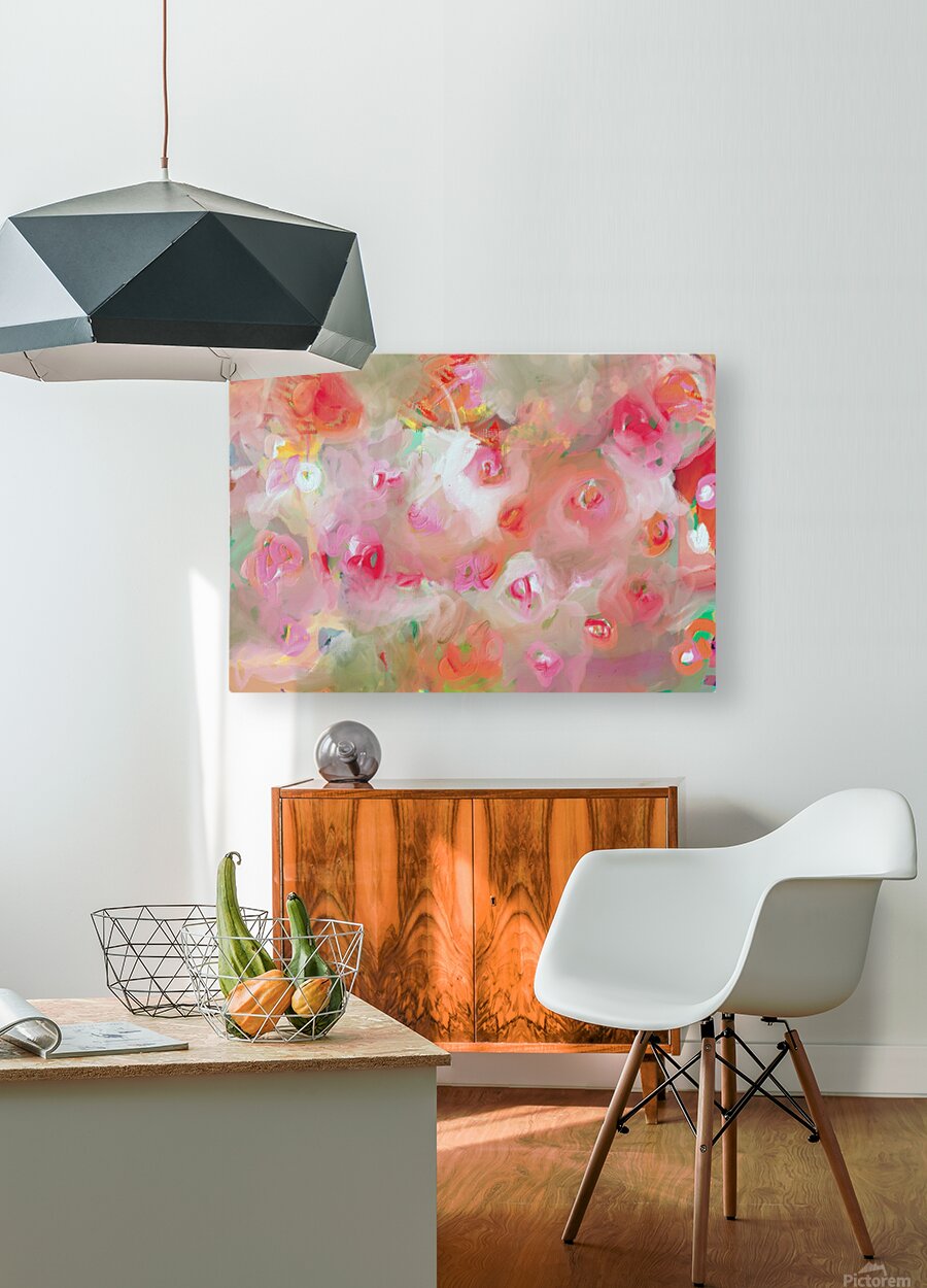 Rosy Options is a cheerful composition with an impressionistic pattern of roses amid soft pastel tones . It is meant to bring a calm exhale to your busy day. The artwork is an abstract painting featuring a vibrant blend of swirling colors. Predominantly, various shades of pink and peach intertwine with touches of white, orange, and green. The forms resemble loosely defined flowers, giving the piece a dynamic, lively feel. The brushstrokes are soft and fluid, contributing to a dreamy, ethereal quality.