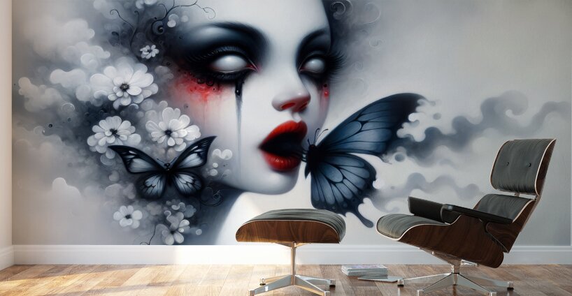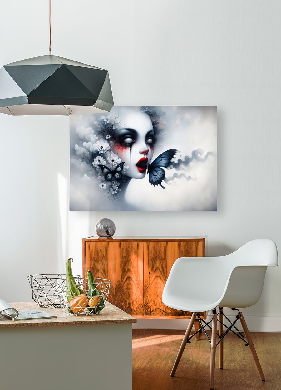 This "Gothic Fantasy Portrait" is a captivating and surreal artwork that blends dark elegance with ethereal beauty. The image showcases a haunting female figure with pale skin, teary eyes, and delicate flowers merging with butterflies that seem to emerge from her being. A central butterfly, vibrant in dark hues, floats from her open lips, creating an otherworldly, dreamlike scene. The dramatic contrast of deep reds, blacks, and soft grays evokes a sense of melancholy and mystery. Perfect for those who appreciate dark fantasy and gothic art, this piece adds an enchanting and bold aesthetic to any space. The high level of detail and striking composition make it a stunning centerpiece, whether displayed in a living room, bedroom, or art collection. Available in various sizes and formats, this artwork can be customized to suit different interiors, making it a versatile addition to any setting. Bring a touch of the surreal and gothic into your space with this mesmerizing fantasy portrait that captures the imagination and invites contemplation.