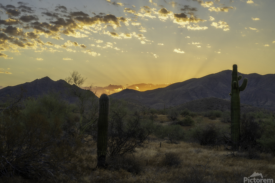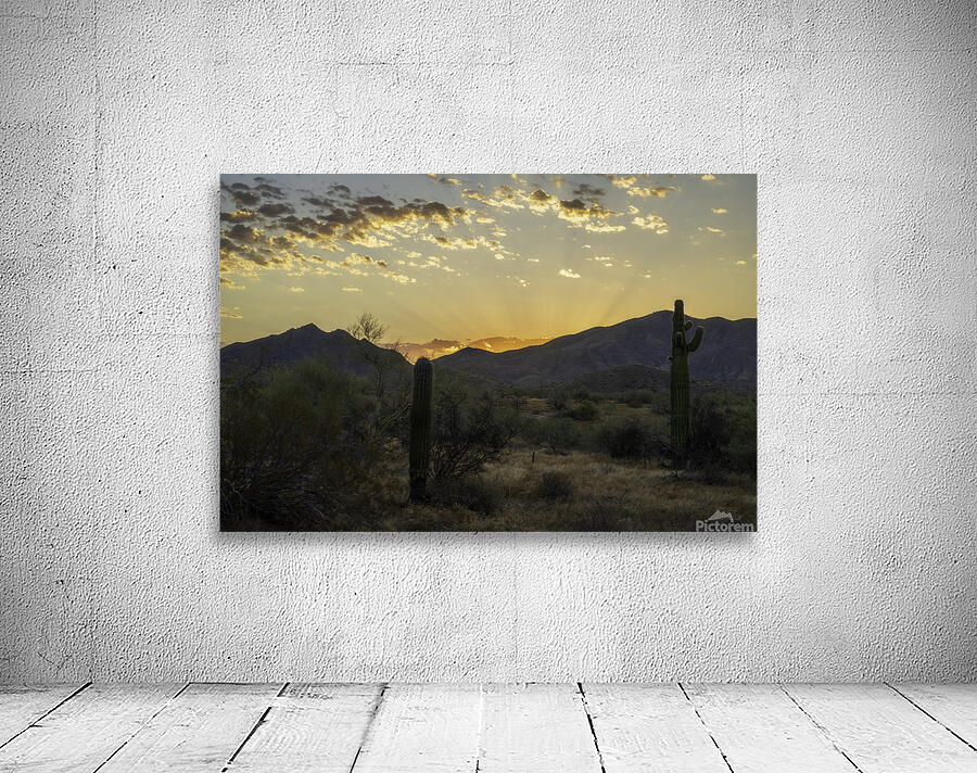 I named this piece "Sonoran Dawn" because it captures the magic of a new day breaking over the Sonoran Desert. I remember standing there in the early morning, just as the first rays of sunlight began to spill over the horizon. The golden hues of the rising sun bathed the landscape in warmth, casting long shadows across the desert floor, while the saguaro cacti stood tall as silent sentinels of this rugged yet peaceful terrain. The sky, dotted with soft clouds, seemed to glow from within as the sun's rays pierced through, creating a stunning display of light and color. This moment felt like a reminder of the quiet beauty that can be found in the desert’s simplicity—perfect for those who are drawn to nature's subtle power and tranquility. This print is available for purchase on Pictorem, where you can choose from a variety of print formats to match your style and space: Available Print Options on Pictorem: Canvas Prints: A textured, museum-quality finish that adds depth. Acrylic Prints: Offering sleekness and enhanced color vibrancy. Metal Prints: For a bold, modern look with sharp details. Wood Prints: Bringing a rustic, natural texture to the artwork. Framed Prints: Fully customizable with a wide selection of frames and mats. Why Choose This Print? Limited Edition: This is a limited-edition print, exclusive to Pictorem. Premium Quality: Printed on archival-quality materials for long-lasting beauty and detail. Desert Serenity: Perfect for those who love the desert landscape and seek a peaceful, nature-inspired addition to their space.
