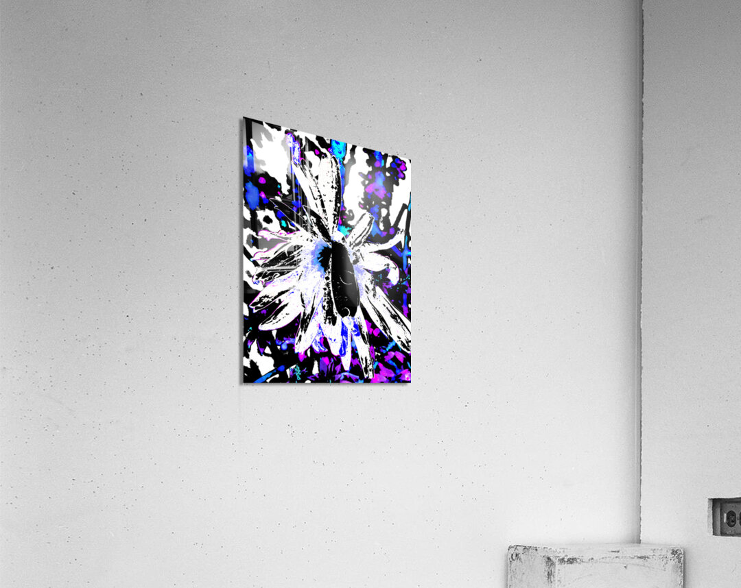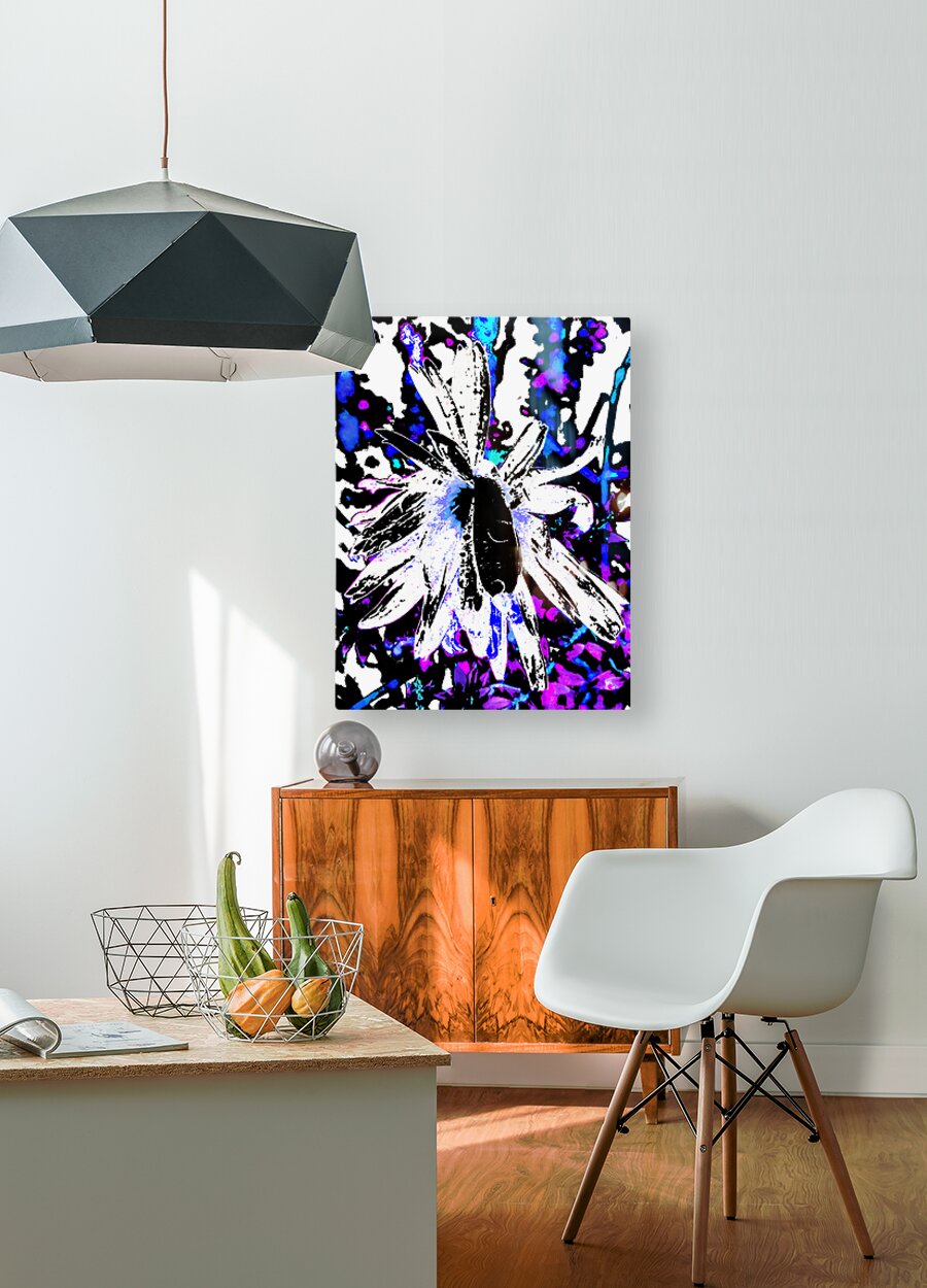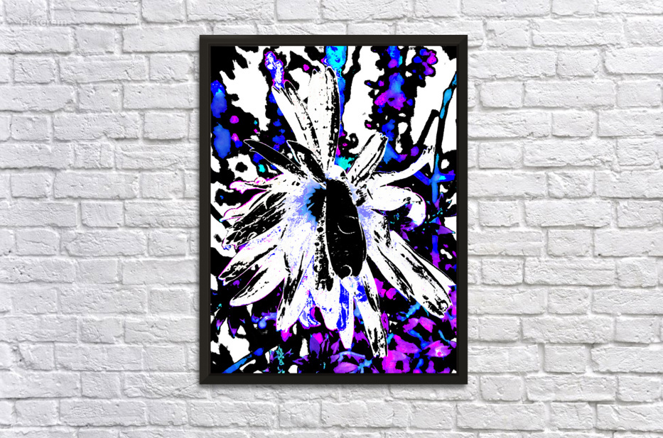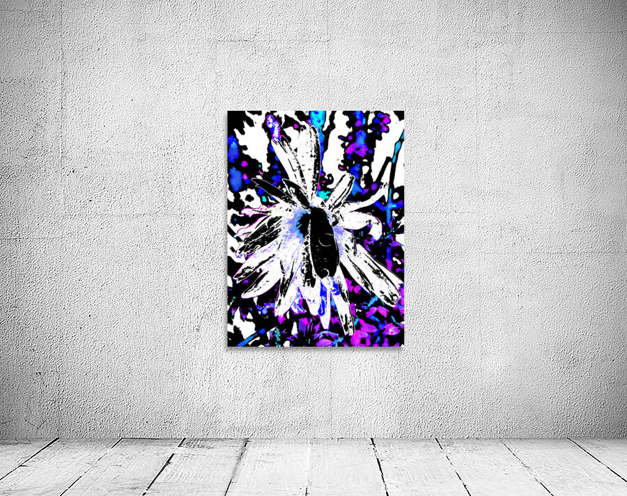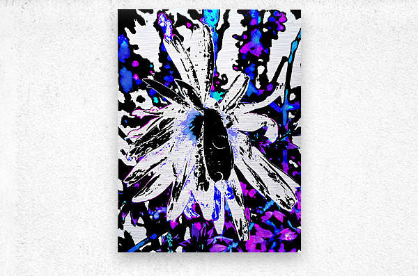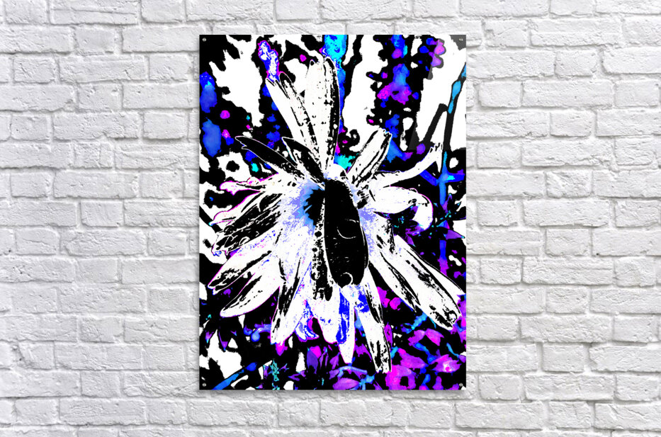 Originally a close up photo of a Daisy flower laterally digitally manipulated to create a stunning piece of contemporary floral art. Features a Daisy with long petals presented in an abstract style, with vivid and contrasting colors of purple, blue, and white dominating the composition. The image's bold and high-contrast colors create a striking visual effect.