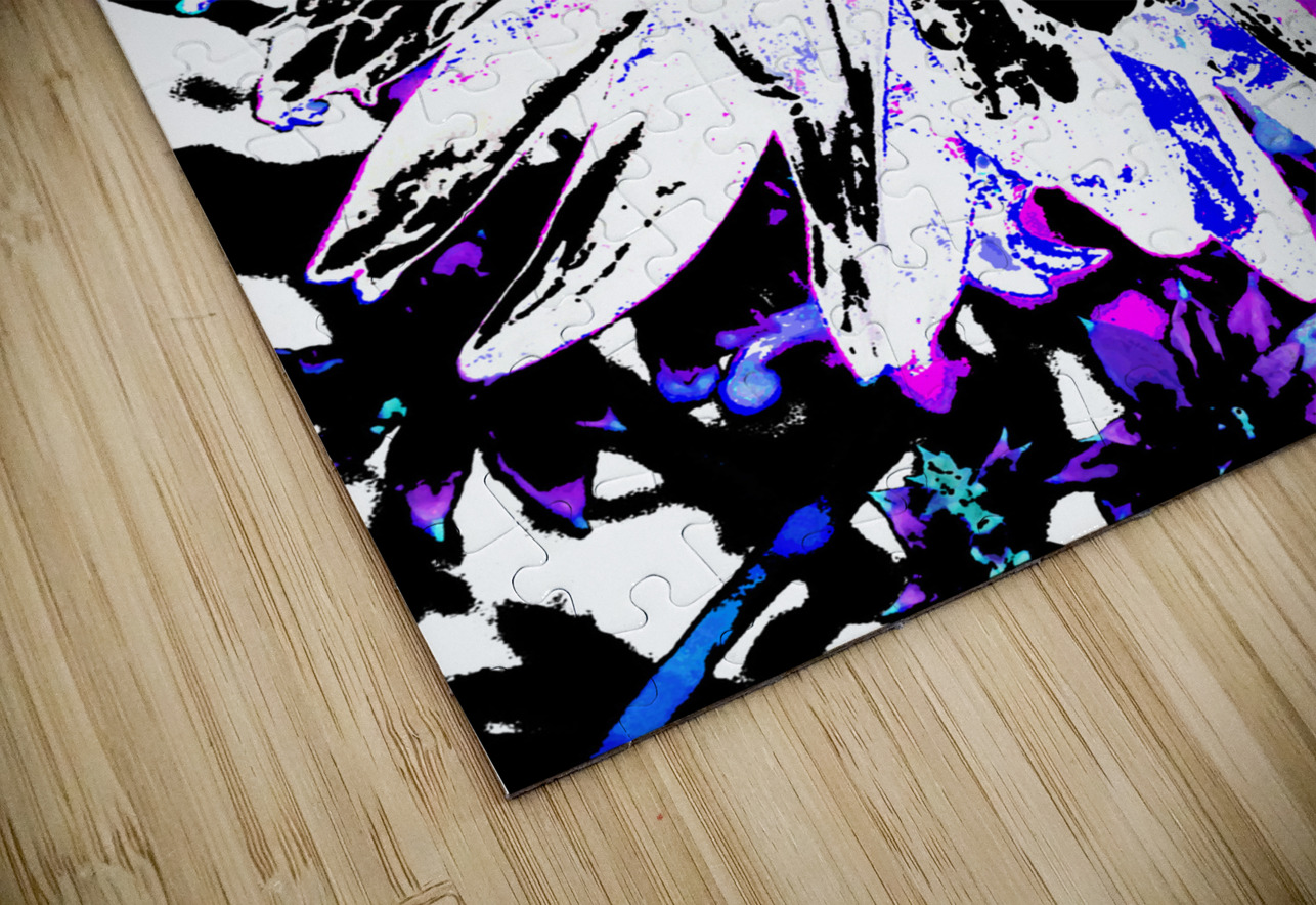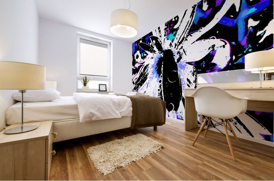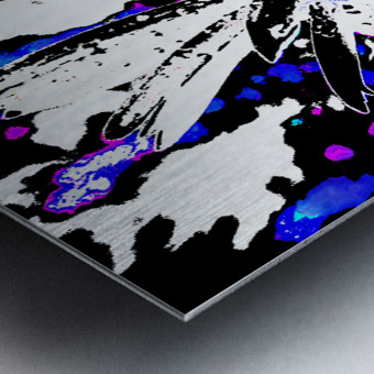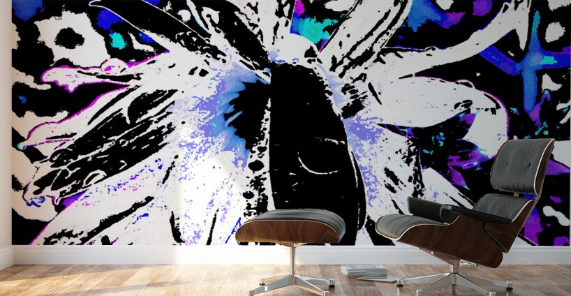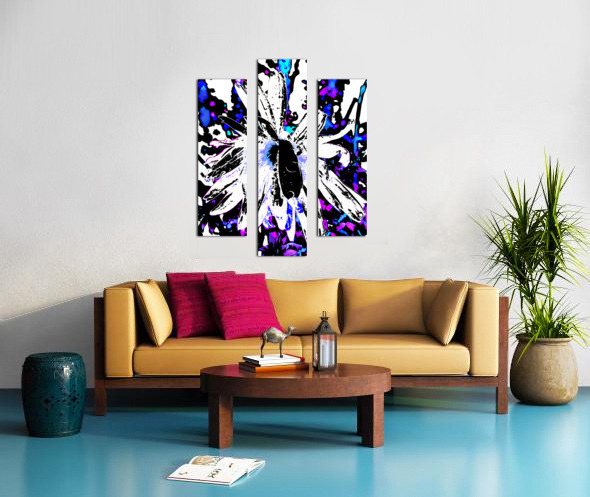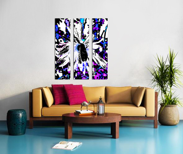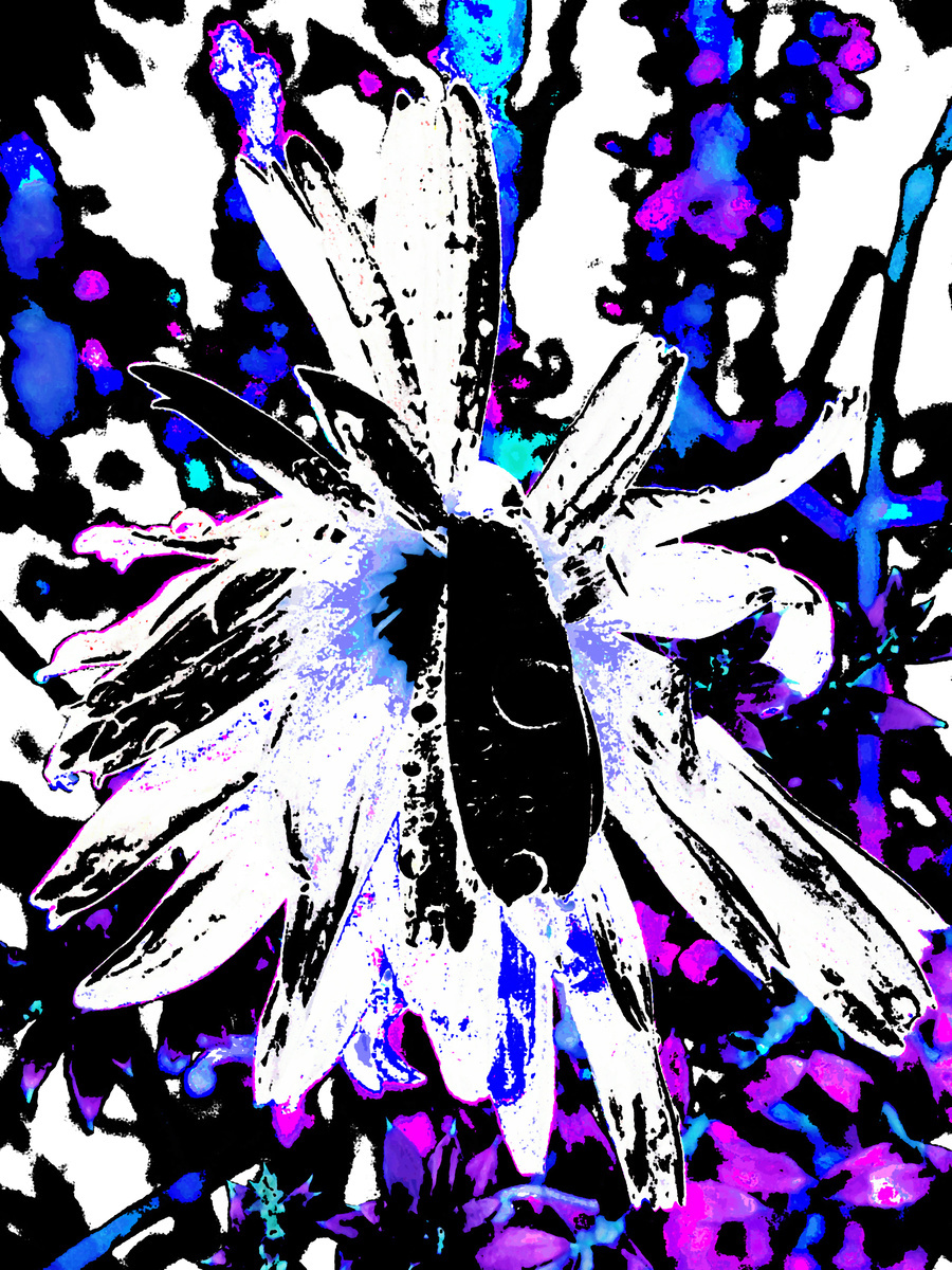 Originally a close up photo of a Daisy flower laterally digitally manipulated to create a stunning piece of contemporary floral art. Features a Daisy with long petals presented in an abstract style, with vivid and contrasting colors of purple, blue, and white dominating the composition. The image's bold and high-contrast colors create a striking visual effect.