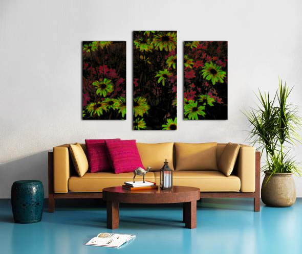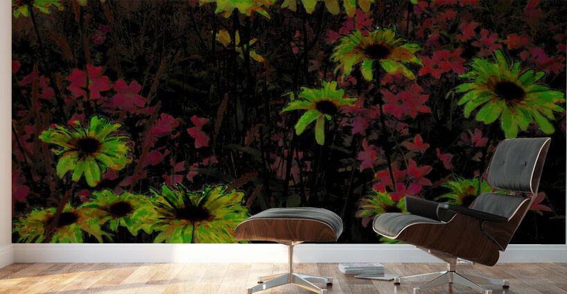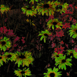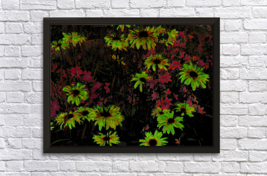 Originally a photo of a flower garden laterally digitally manipulated to create a stunning piece of contemporary floral art. Features brightly colored daisy flowers in shades of green and yellow stand out against a contrasting dark background, interspersed with smaller pink blossoms. The scene has a vibrant and surreal quality, evoking a dreamlike garden.