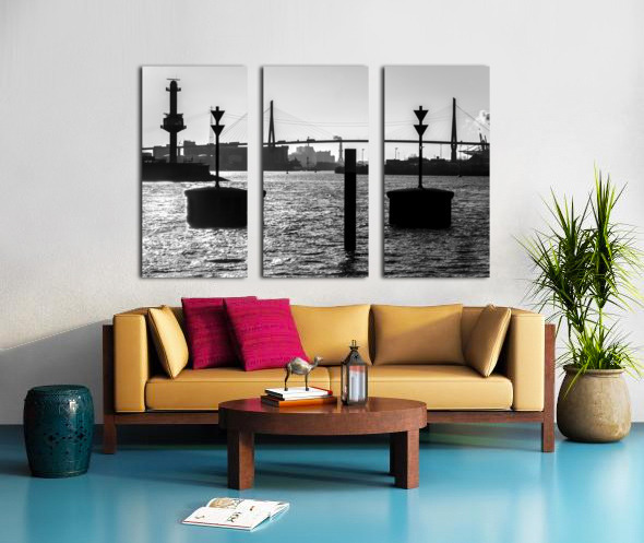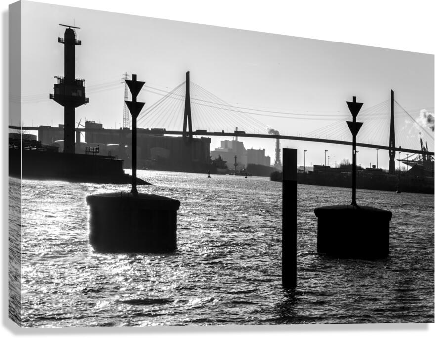 BLACK AND WHITE SHOT OF HARBOR PANORAMA AND KöHLBRANDBRüCKE AT THE ELBE RIVER IN HAMBURG GERMANY  CALADOART  Canvas Print