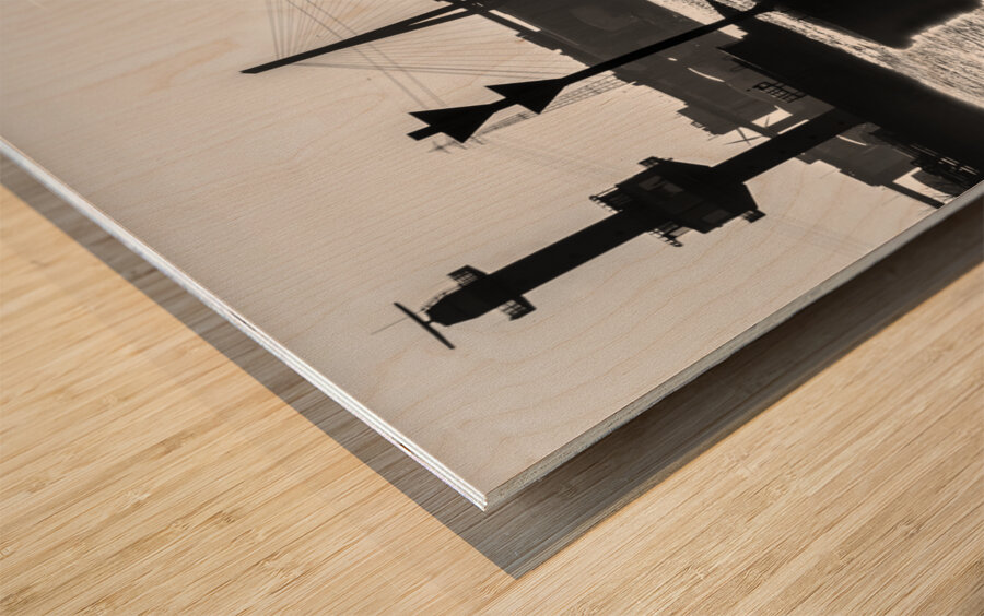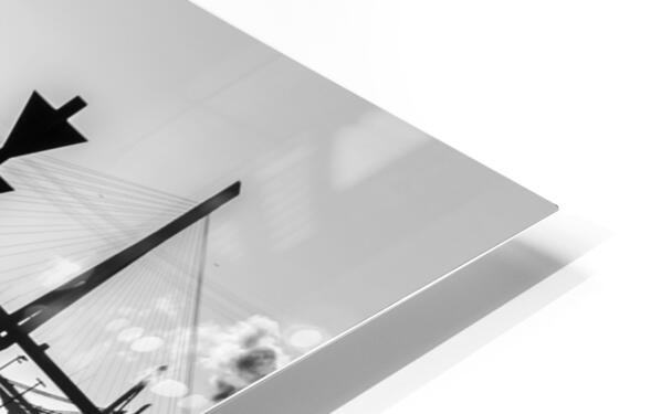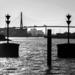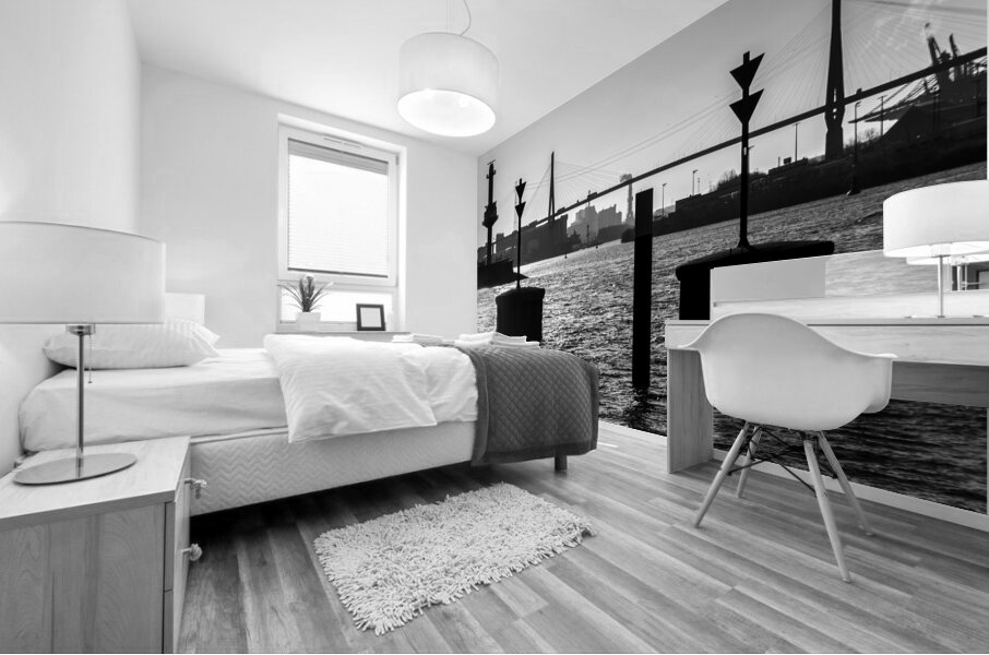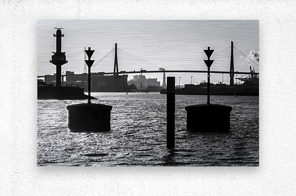 ABOUT THIS ARTWORK: BLACK AND WHITE SHOT OF HARBOR PANORAMA AND KöHLBRANDBRüCKE AT THE ELBE RIVER IN HAMBURG GERMANY