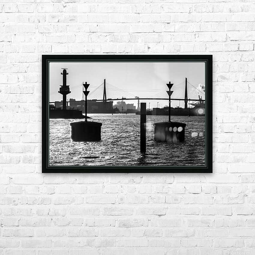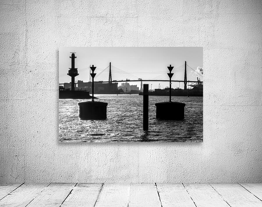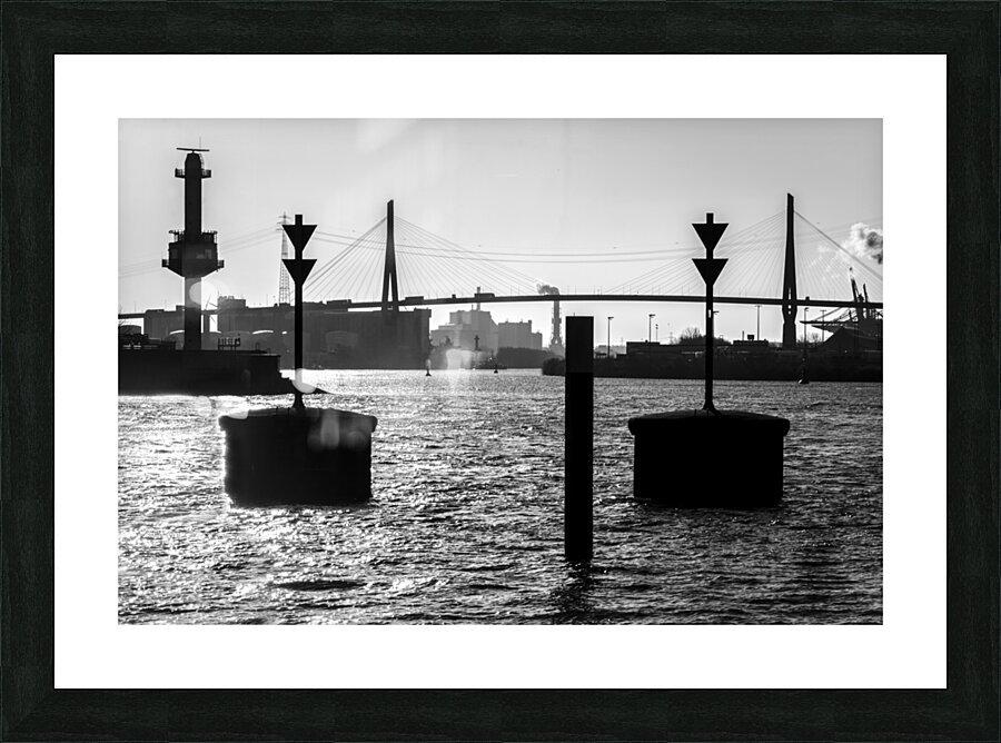 Black and white shot of harbor panorama and Köhlbrandbrücke at the Elbe River in Hamburg Germany  Wall Decor Frame