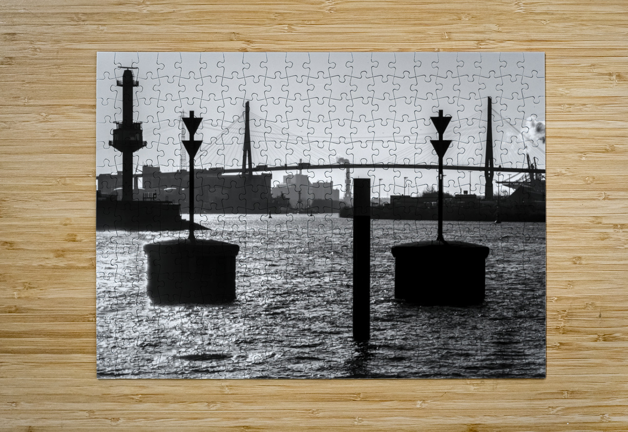 Black and white shot of harbor panorama and Köhlbrandbrücke at the Elbe River in Hamburg Germany  caladoart Puzzle printing