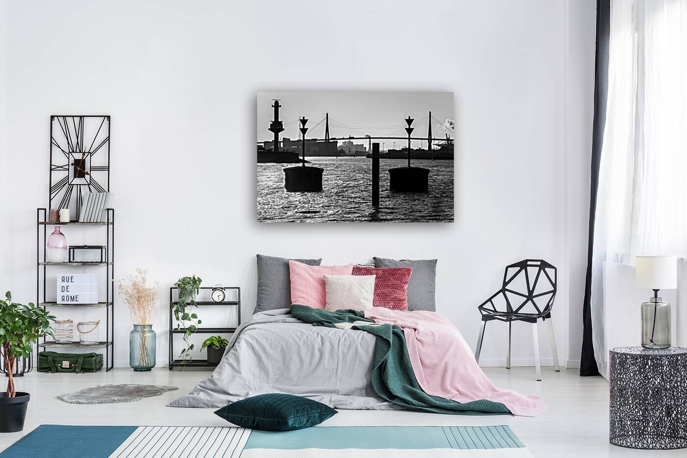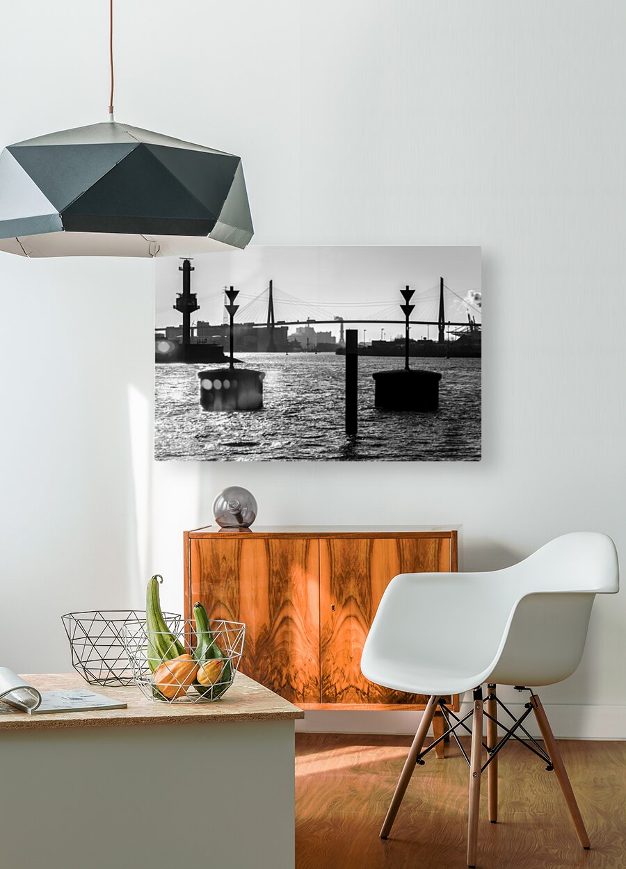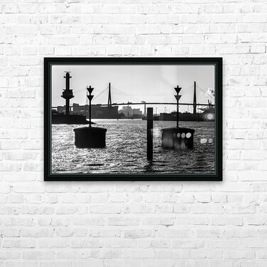 Get this artwork "Black and white shot of harbor panorama and Köhlbrandbrücke at the Elbe River in Hamburg Germany " in a framed print.