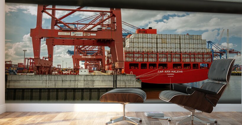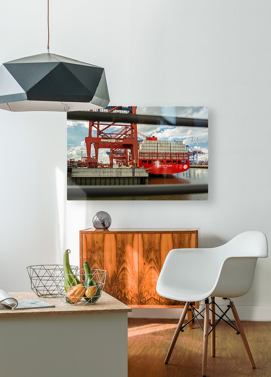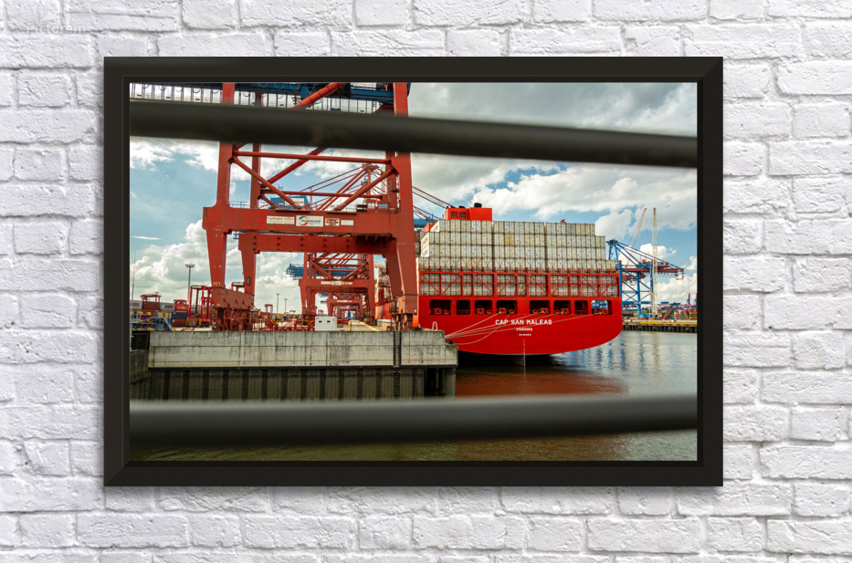 ABOUT THIS ARTWORK: SHIP UNLOADING AT A CONTAINER TERMINAL IN THE PORT AREA OF HAMBURG GERMANY