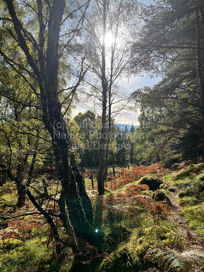 I took this shot during a lovely autumnal walk through the Scottish Highlands. Features sunlight as it filters through a lush forest, casting dappled light on the vibrant ferns and dense undergrowth. A narrow path winds through the scene, inviting exploration amid the tall trees.