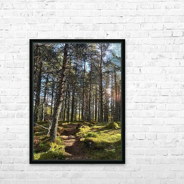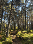 I took this shot during a stunning autumnal nature walk in the Scottish Highlands. Features sunlight filtering through the dense Pine forest, illuminating a winding path surrounded by tall trees. Moss-covered ground and vibrant greenery create a serene, natural atmosphere.