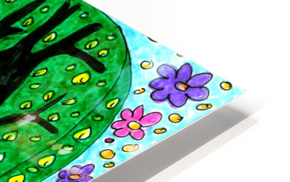 A hand drawn design created using coloured ink pens and paper. Features a whimsical scene with vibrant trees and playful owls surrounded by colorful flowers and leaves. The sky is dotted with cheerful blooms and a shining sun, adding to the lively nature theme.