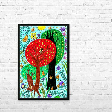 A hand drawn design created using coloured ink pens and paper. Features a whimsical scene with vibrant trees and playful owls surrounded by colorful f...[+]