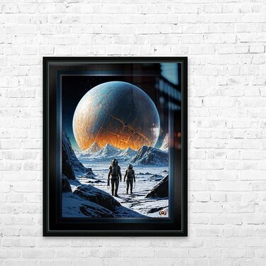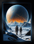 Two astronauts stand on a snowy terrain beneath a vast, luminous planet that dominates the sky. Jagged mountains surround the explorers, adding to the...[+]