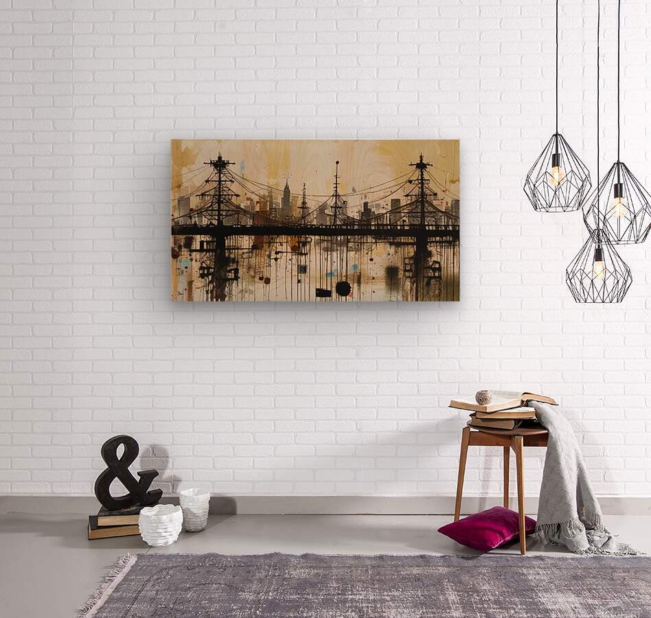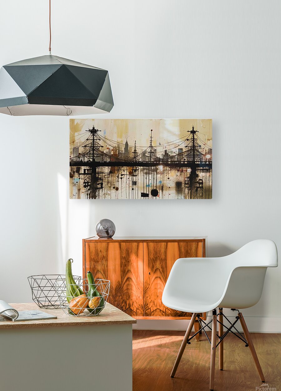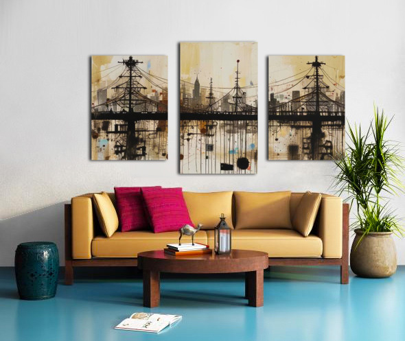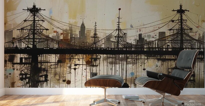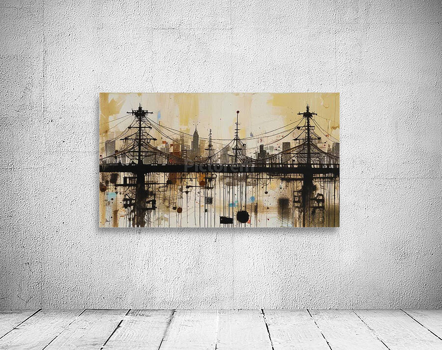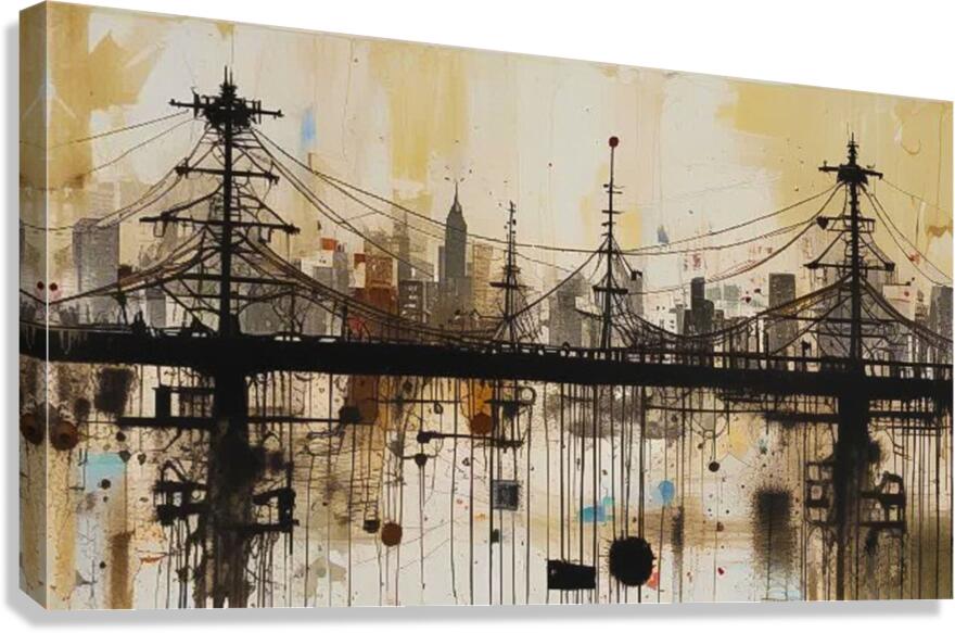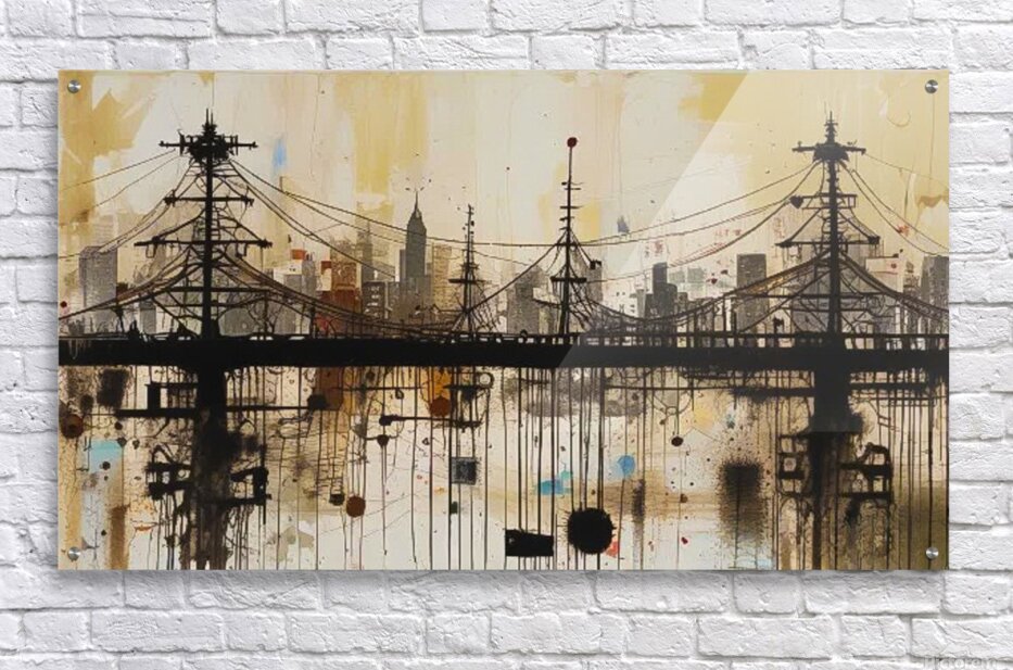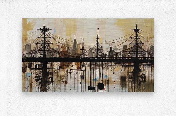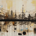 The artwork depicts a stylized cityscape, with a bridge spanning across the foreground. The city buildings are rendered in silhouette against a muted, cream-colored background, creating a sense of distance and abstraction. The bridge, also in silhouette, is a complex web of beams and cables, suggesting a sense of infrastructure and connectivity. The artist has used a drip technique to create a layered effect, with black paint dripping down from the bridge and cityscape onto the background. The drips create a sense of movement and energy, and they also add a layer of texture and depth to the artwork. The overall effect is one of urban decay and neglect, yet there is a sense of beauty and mystery in the way the artist has captured the city's essence. The muted colors, the abstract forms, and the dripping paint all suggest a sense of time passing and a city that is both familiar and strange.