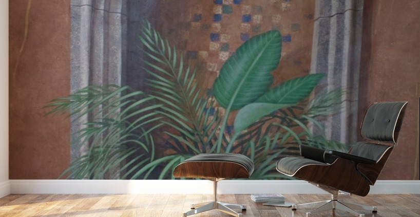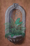 A Trompe Loeil, Tuscany style, of plants and ferns in a wall Alcove. A great idea for a wall mural or wallpaper, end of a hallway, or dinning room, living room, or outdoor wall.