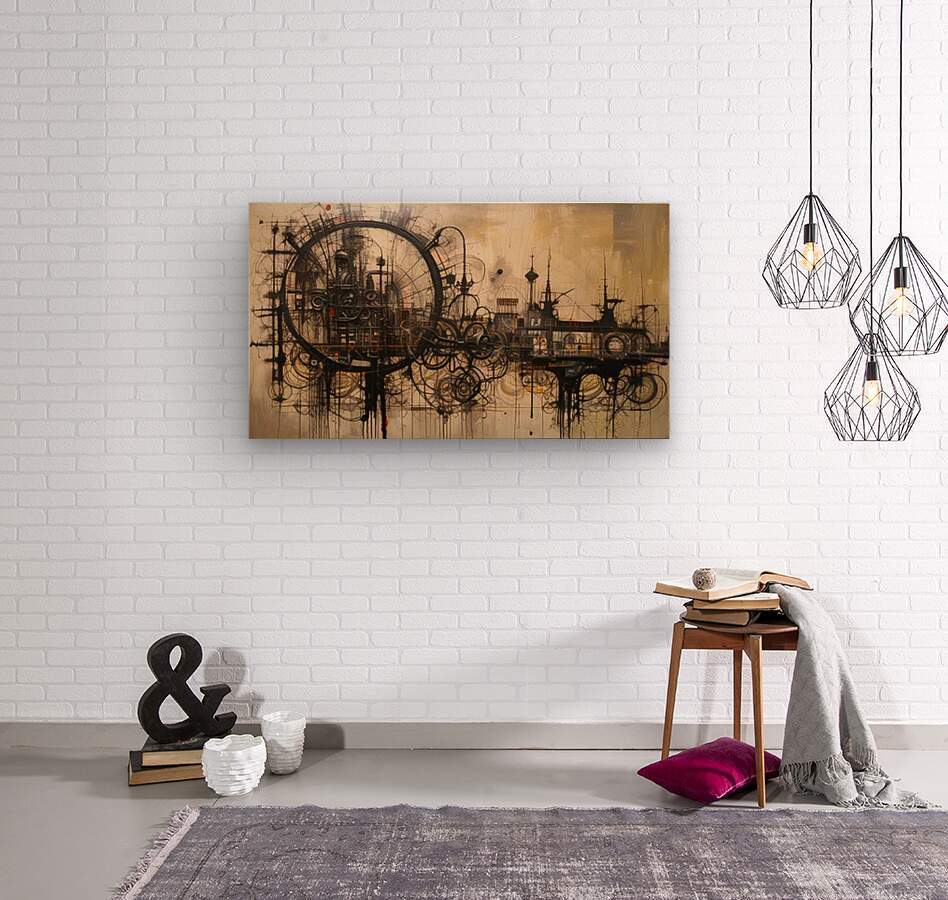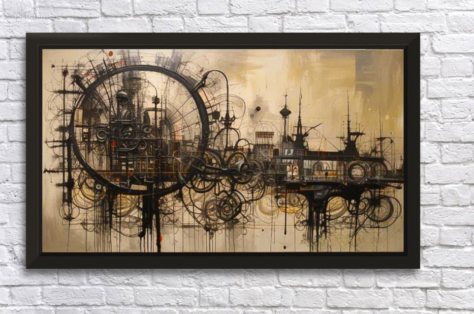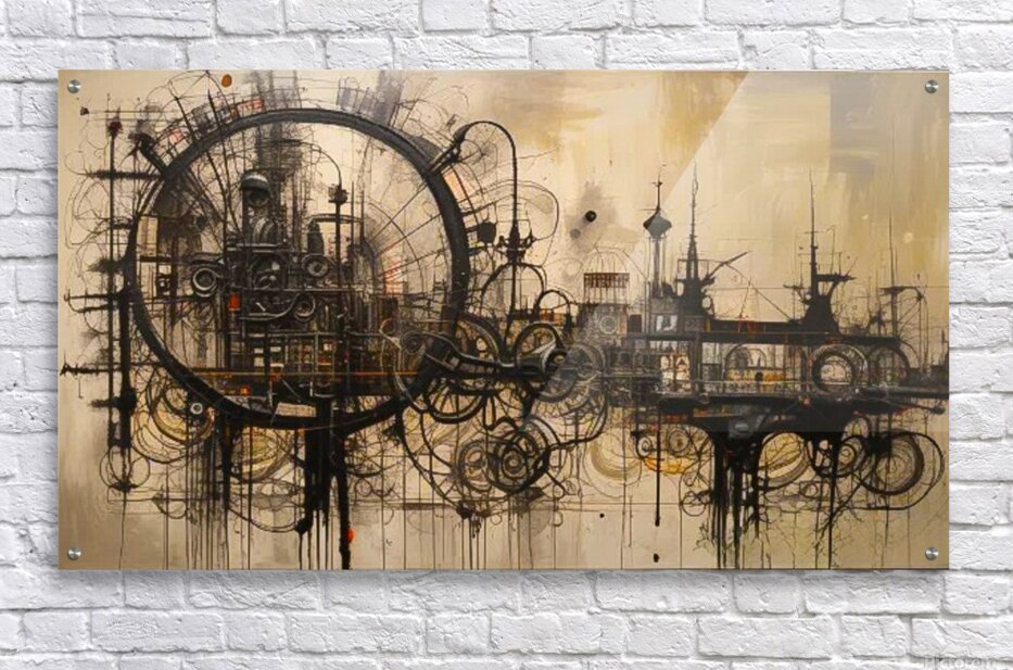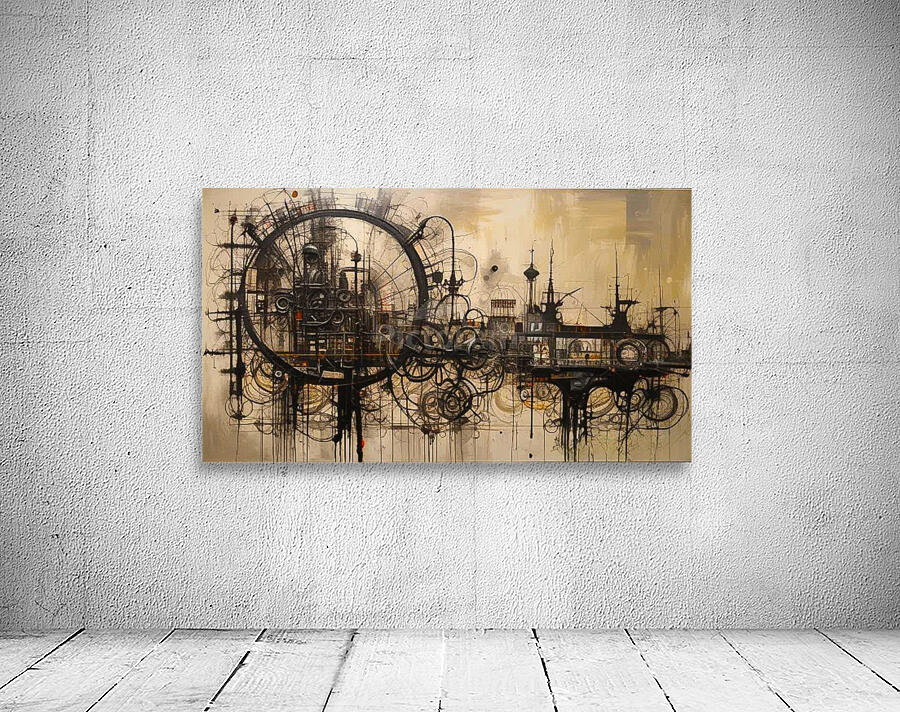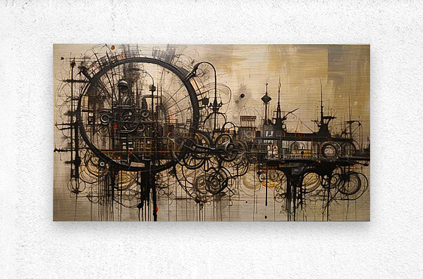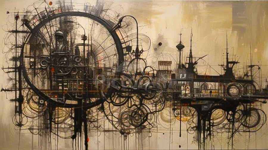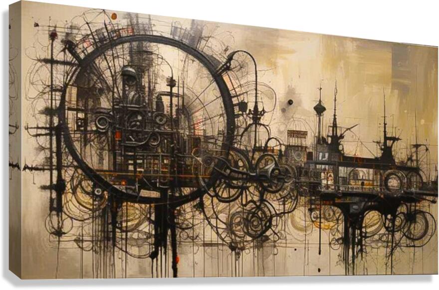 The image is a digital painting that depicts a fantastical, steampunk-inspired cityscape. The artwork is composed of intricate, overlapping lines and shapes, creating a sense of depth and complexity. A large, circular structure dominates the left side of the composition, appearing as a giant wheel or gear. It is surrounded by smaller, interconnected gears and cogs, suggesting a vast and intricate machinery. The cityscape itself is built upon a network of platforms and bridges, with towering structures reaching towards the sky. The artist's use of dark and light tones creates a sense of mystery and wonder, inviting the viewer to explore the hidden depths of this imaginative world. The overall effect is one of both awe and intrigue, suggesting a world full of hidden secrets and possibilities.
