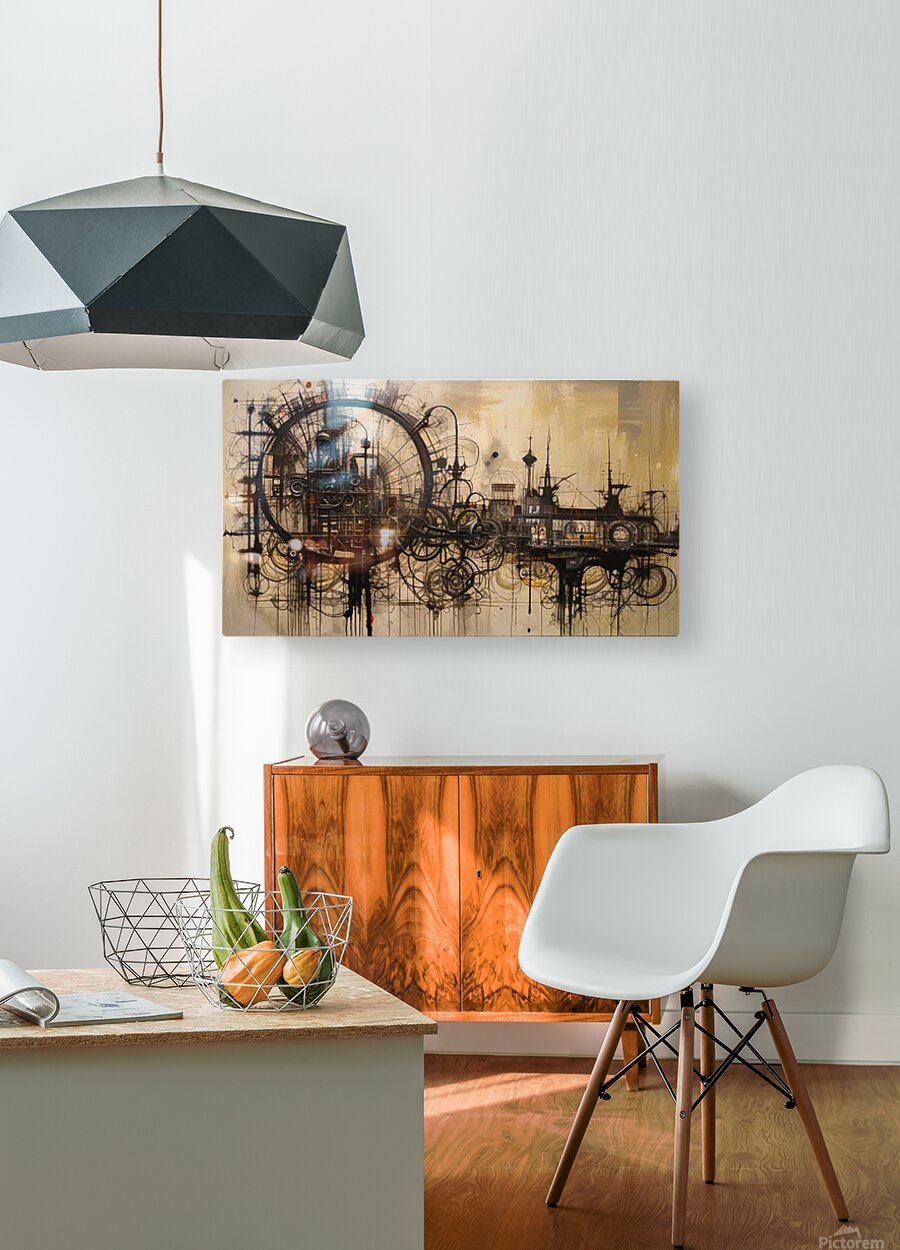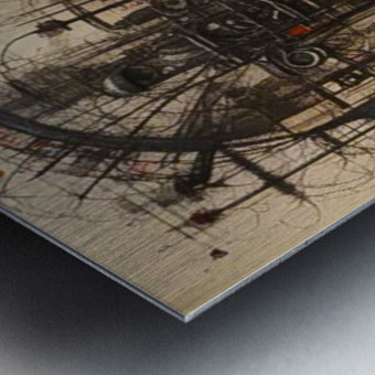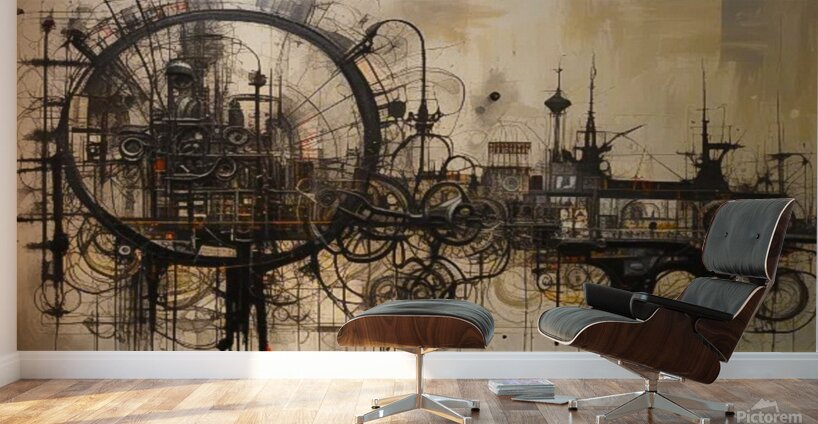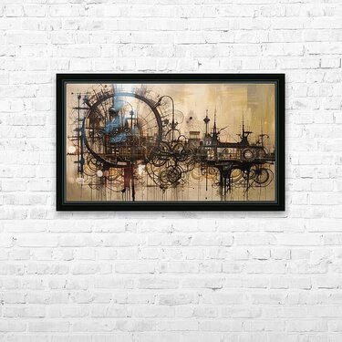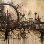 The image is a digital painting that depicts a fantastical, steampunk-inspired cityscape. The artwork is composed of intricate, overlapping lines and ...[+]