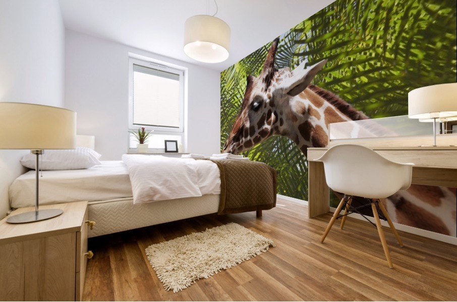 Eclectic and whimsical giraffe on a green palm background. Great for a girls room or play room or as an accent if you are working with animal prints. Great as a mural to add colors to a den, playroom or living room.
