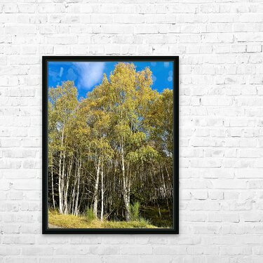 I took this shot during a lovely autumnal walk in the Scottish Highlands. Features tall golden Birch trees with slender trunks standing under a clear blue sky, their leaves a mix of green and yellow, heralding the arrival of autumn. Sunlight filters through the foliage, creating a serene and peaceful atmosphere in the forest.