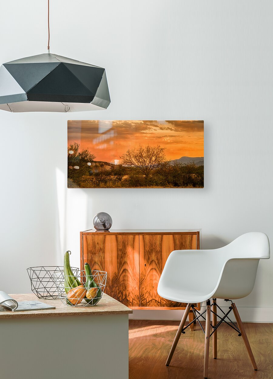 As my wife and I were driving back from the store in Cottonwood Arizona the sky started to light up in the most breathtaking way. We couldnt resist pulling over onto a dirt road to capture this moment. Behold a mesmerizing oasis of tranquility where time seems to linger in an eternal calm. This captivating photograph unveils a desert landscape bathed in the soft embrace of a setting sun. The sky above is a masterpiece of celestial artistry a gradient tapestry painted with enchanting hues of orange pink and blue. Wisps of clouds meander gently across the horizon whispering secrets carried by the dusk. In the foreground sparse desert vegetation subtly anchors the scene. A lone tree stands as a sentinel its silhouette etched against the vibrant twilight offering both contrast and harmony. The undulating contours of distant hills weave a gentle rhythm inviting the viewer to explore the vastness and depth of this serene sanctuary. As day gracefully yields to night this image captures not just the play of light and shadow but the essence of a landscape at peace with itself—a moment when natures serenity speaks to the soul unveiling mysteries often overlooked. Allow yourself to be drawn into this enigmatic dance of colors an experience as ephemeral as the desert breeze yet as enduring as the whispers of the dunes.
