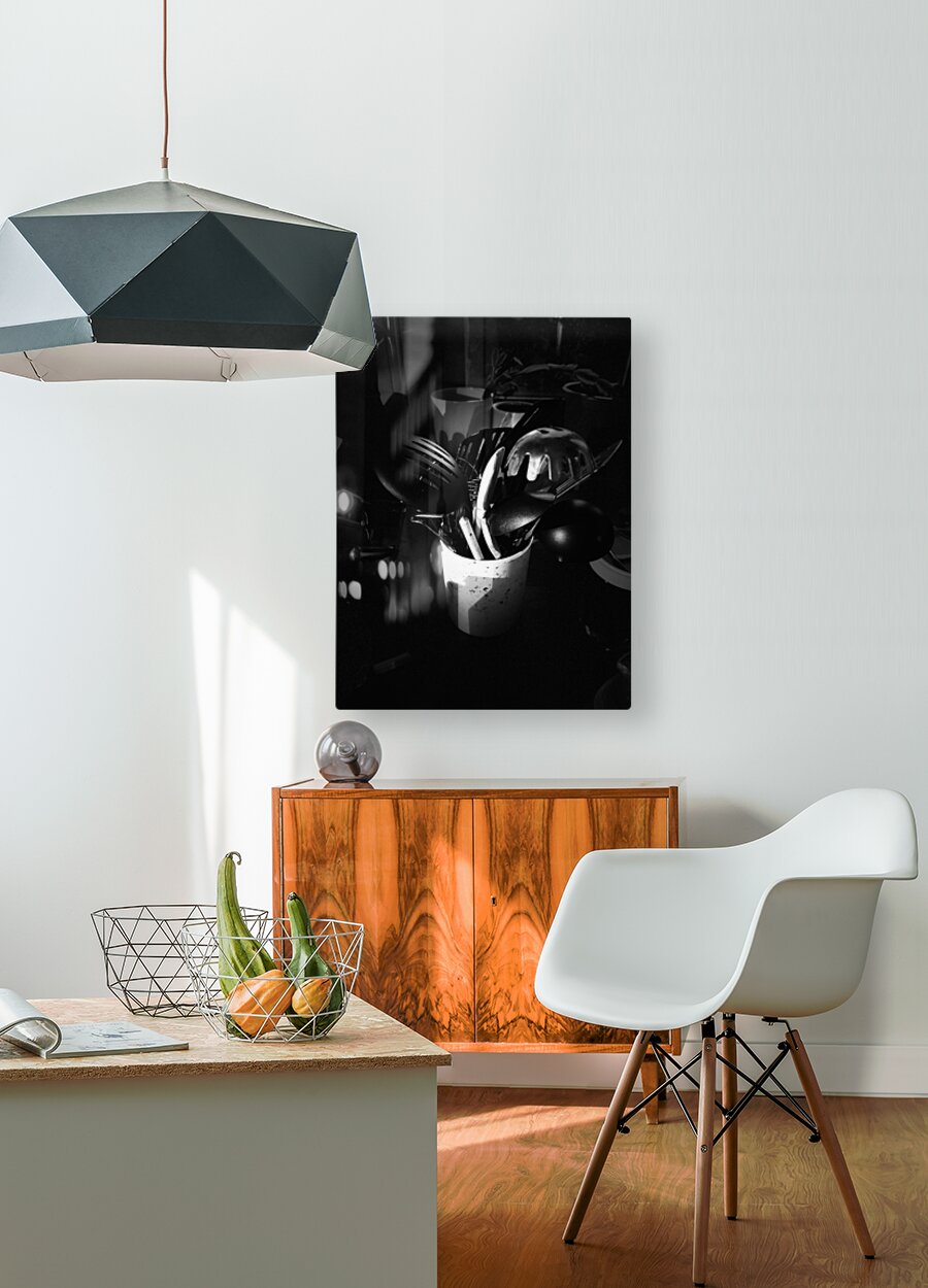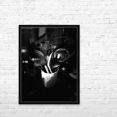 Features a dark, moody black-and-white photograph captures various kitchen utensils in a white container, illuminated by a focused light source. The b...[+]