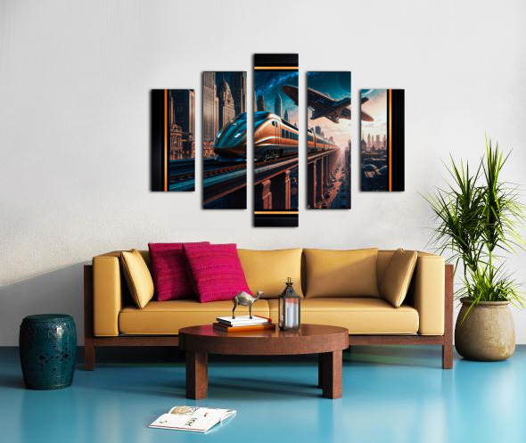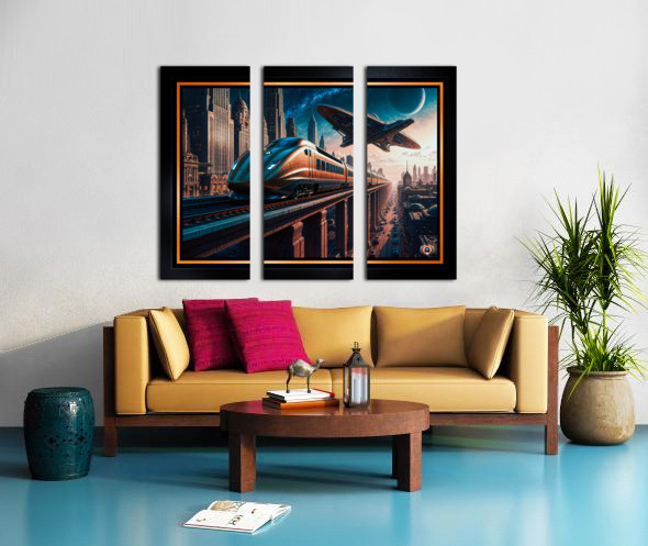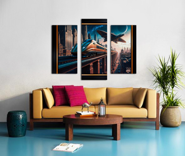 Retro-Futurism Cityscape With High Speed Train And Hovering Spacecraft Awe-Inspiring AI Concept Art by Xzendor7 Canvas print