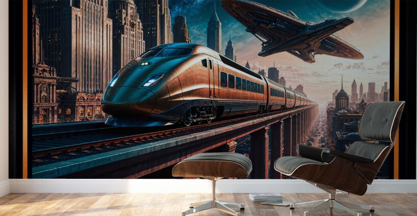 A sleek, futuristic train speeds through a cityscape with towering skyscrapers, while a spaceship hovers above against a backdrop of planets and stars...[+]