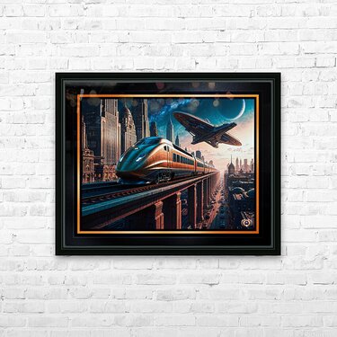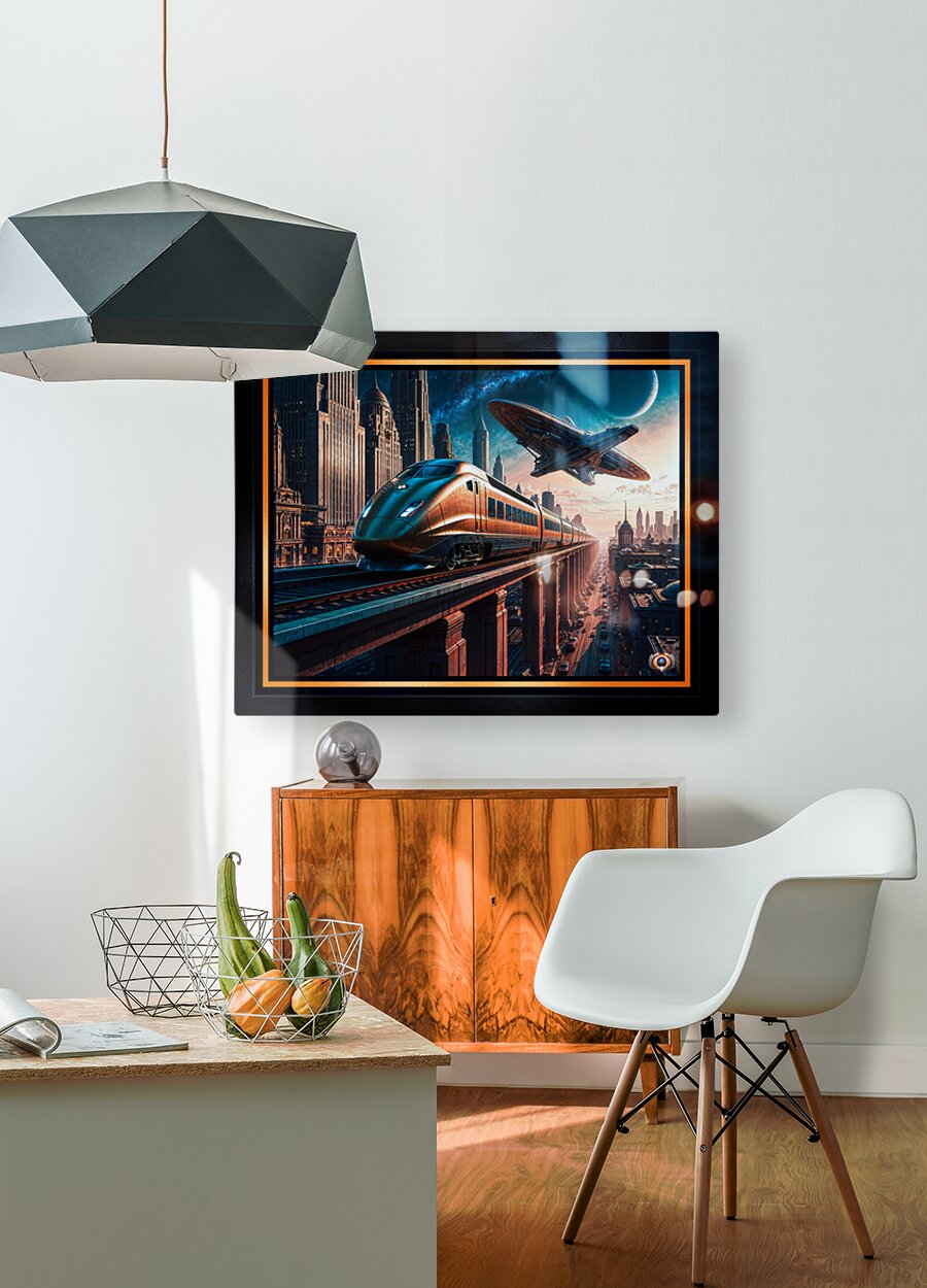 Retro-Futurism Cityscape With High Speed Train And Hovering Spacecraft Awe-Inspiring AI Concept Art by Xzendor7 Picture Frame Printing