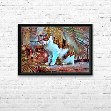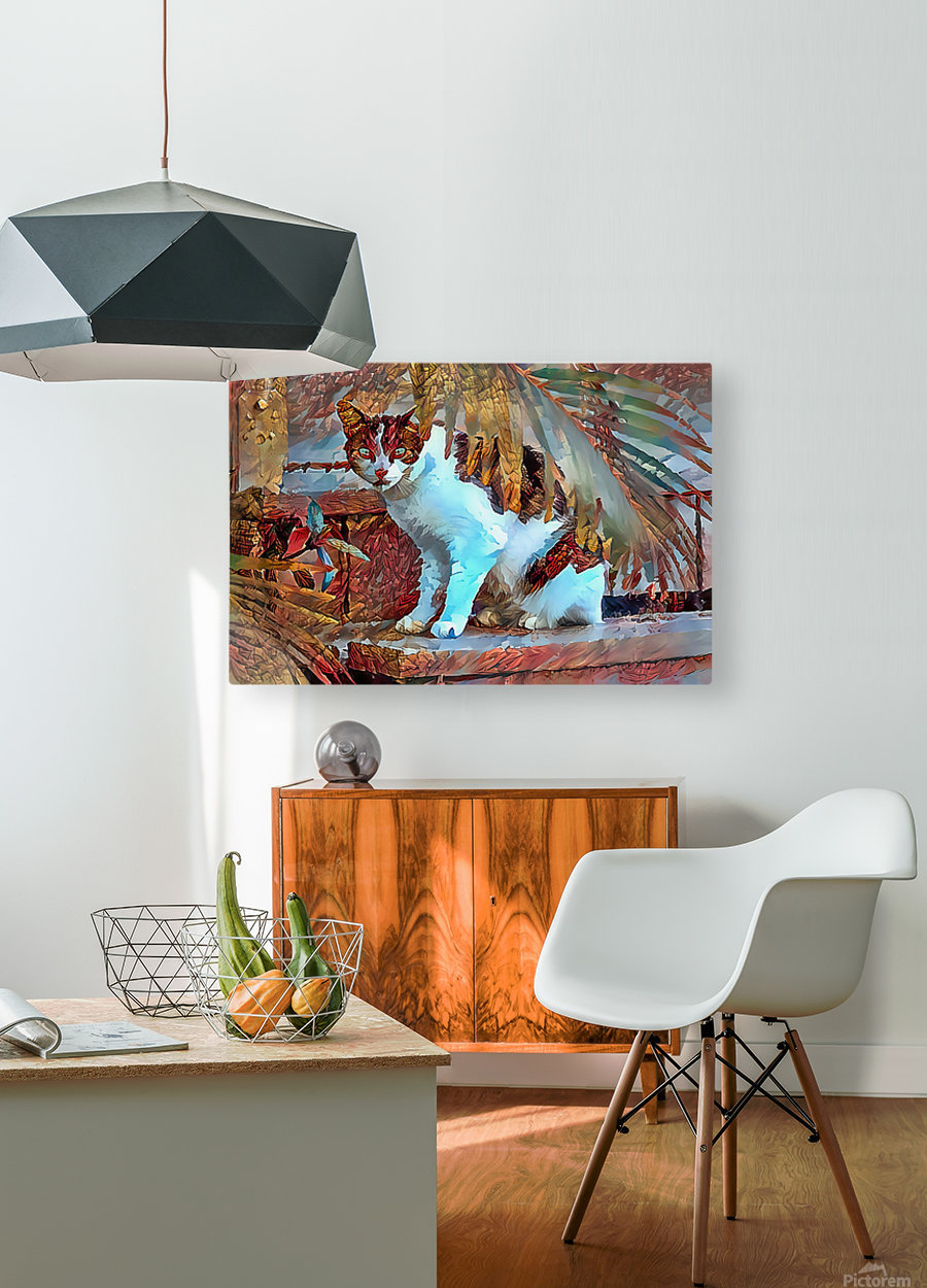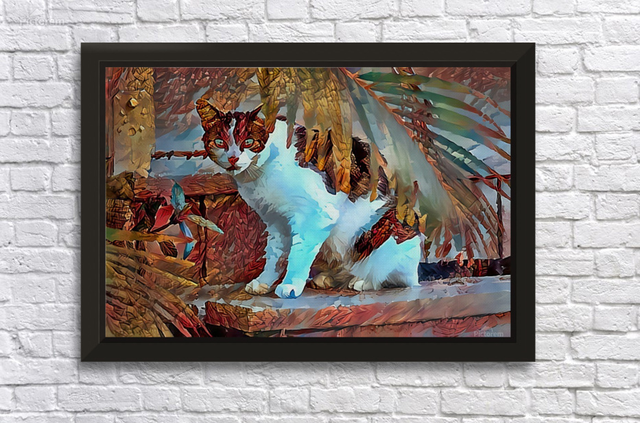 Peeking Out by HH Photography of Florida. Sitting on the front porch steps, a pretty calico kitty named Juno peeks out from behind a tropical palm frond. Juno loves to visit all the porches in the neighborhood and makes his daily rounds from house to house, knowing he’ll get a treat wherever he goes. Photographed on the Florida Gulf coast and digitally enhanced for an artistic presentation.