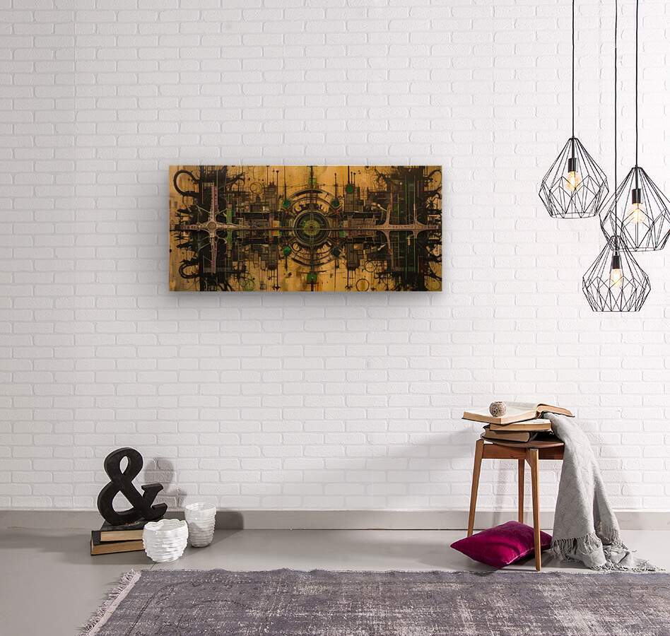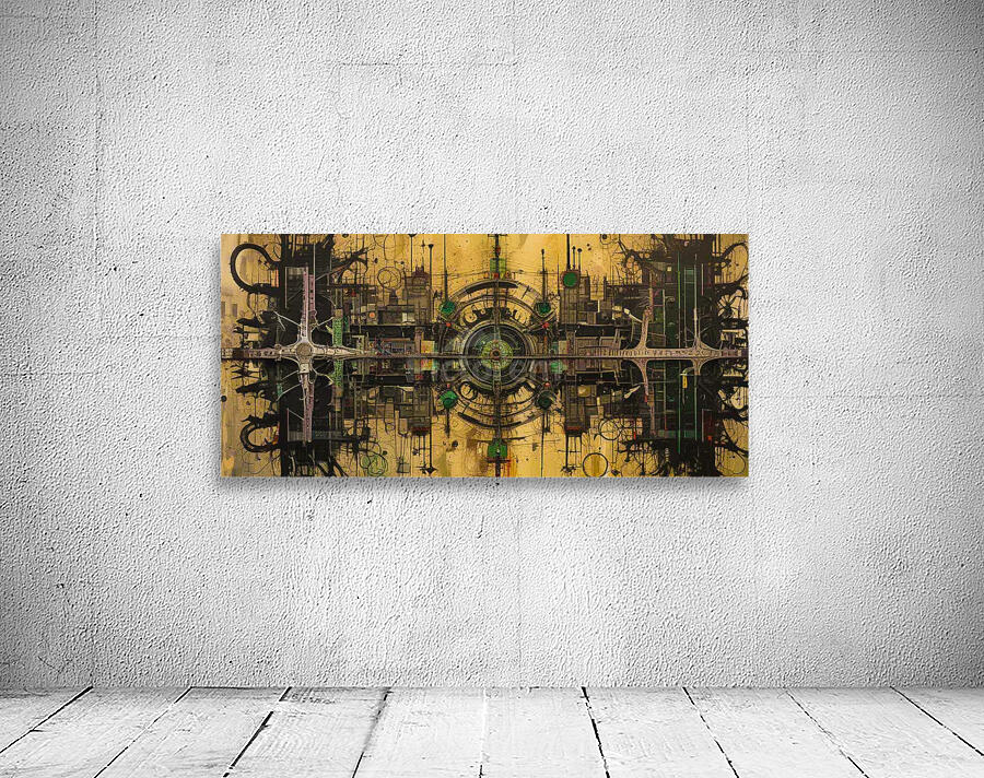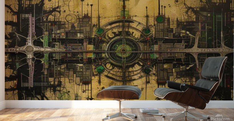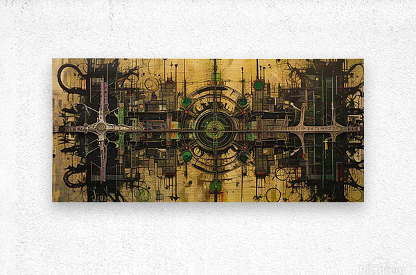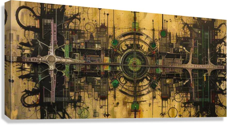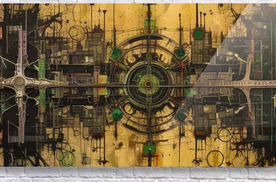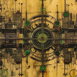 The image is a digital artwork depicting a complex, intricate, and almost mechanical structure. The central element is a large, circular gear-like structure with a series of concentric circles and a cross-shaped design at its core. This central element is surrounded by a network of smaller gears, pipes, and architectural elements, creating a sense of intricate interconnectedness. The overall composition is symmetrical, with the central element acting as a focal point. The color palette is muted and earthy, with shades of brown, green, and black dominating the image. The artwork evokes a sense of mystery and intrigue, suggesting a hidden world of gears and mechanisms. The overall effect is that of a complex and intricate machine, perhaps a clockwork universe or a fantastical engine of some kind.