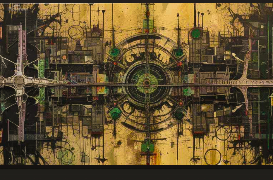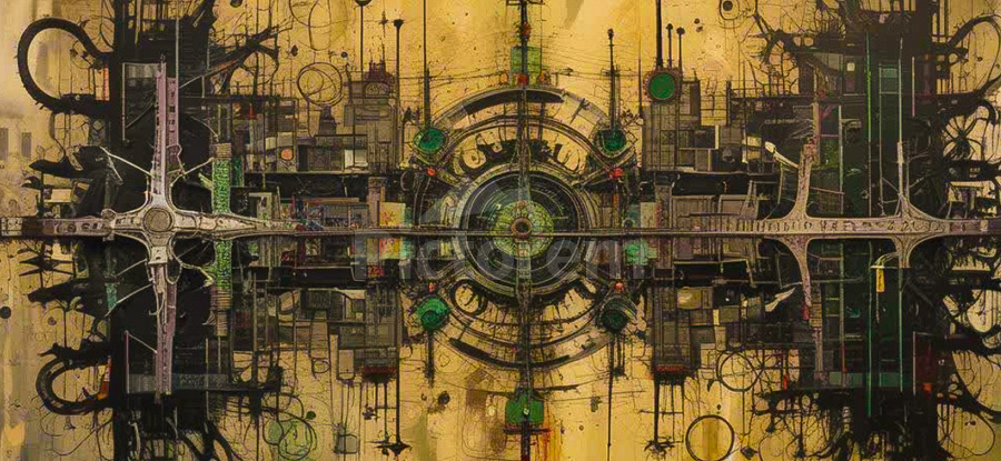 The image is a digital artwork depicting a complex, intricate, and almost mechanical structure. The central element is a large, circular gear-like str...[+]
