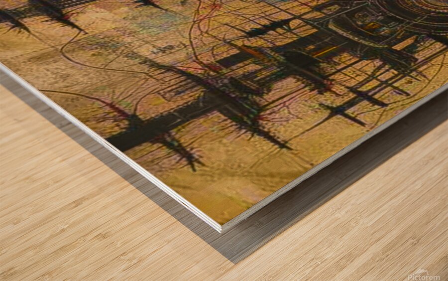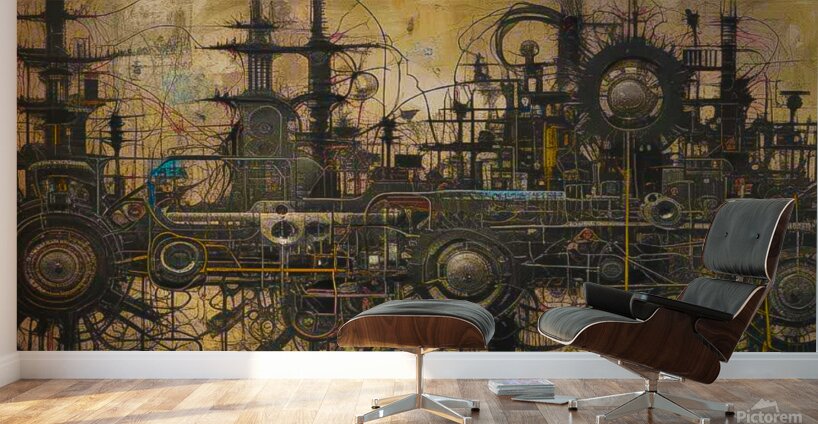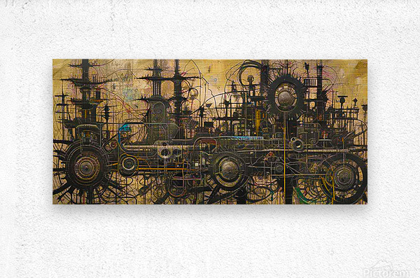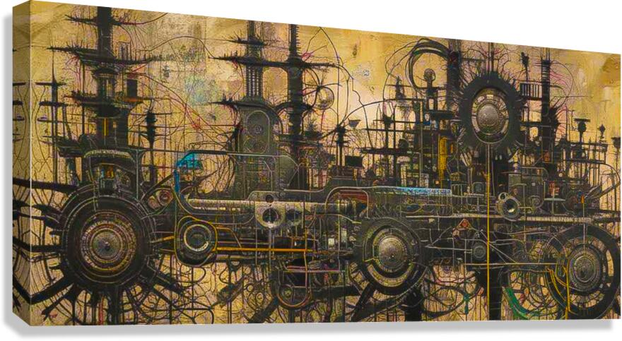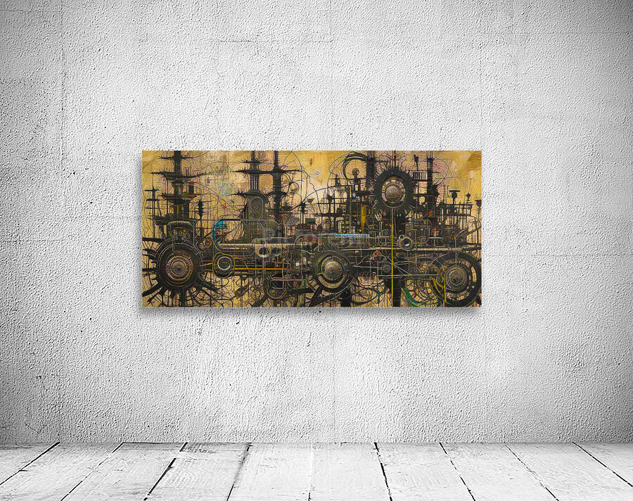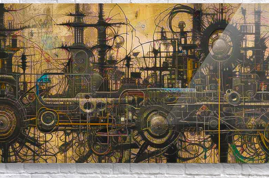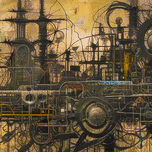 The image is a digital art piece that depicts a complex and intricate machine or structure. It appears to be made up of various interconnected gears, pipes, and other mechanical elements. The background is a warm, gold-toned canvas, with faint lines and textures reminiscent of parchment or aged paper. The machine itself is rendered in dark, almost black tones, creating a strong contrast against the background. The overall effect is one of intricate detail and technological complexity, hinting at a futuristic or steampunk-inspired world. The artist seems to have used a combination of digital tools and techniques to create this highly detailed and visually appealing piece.